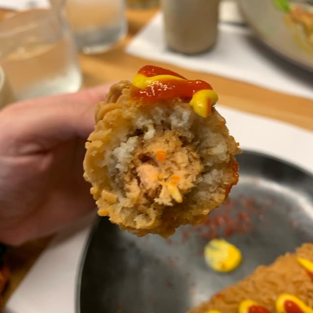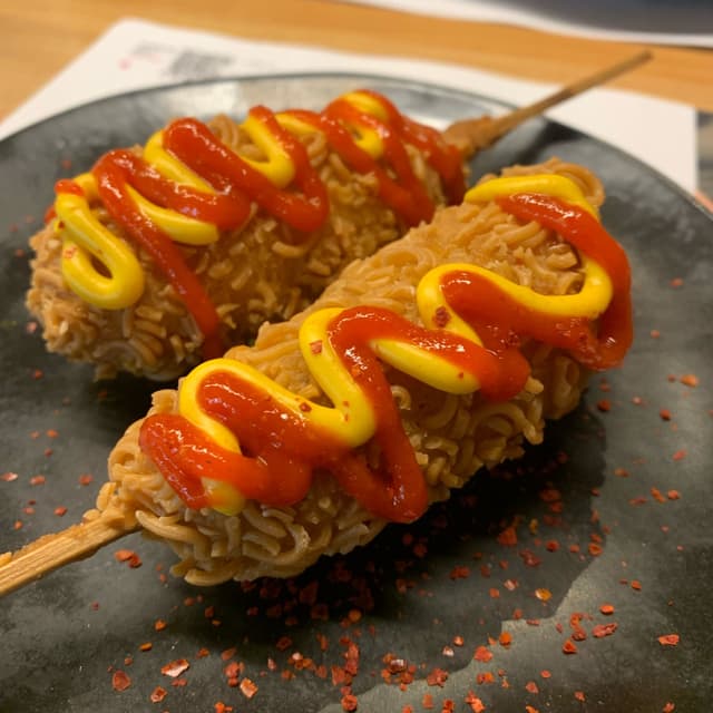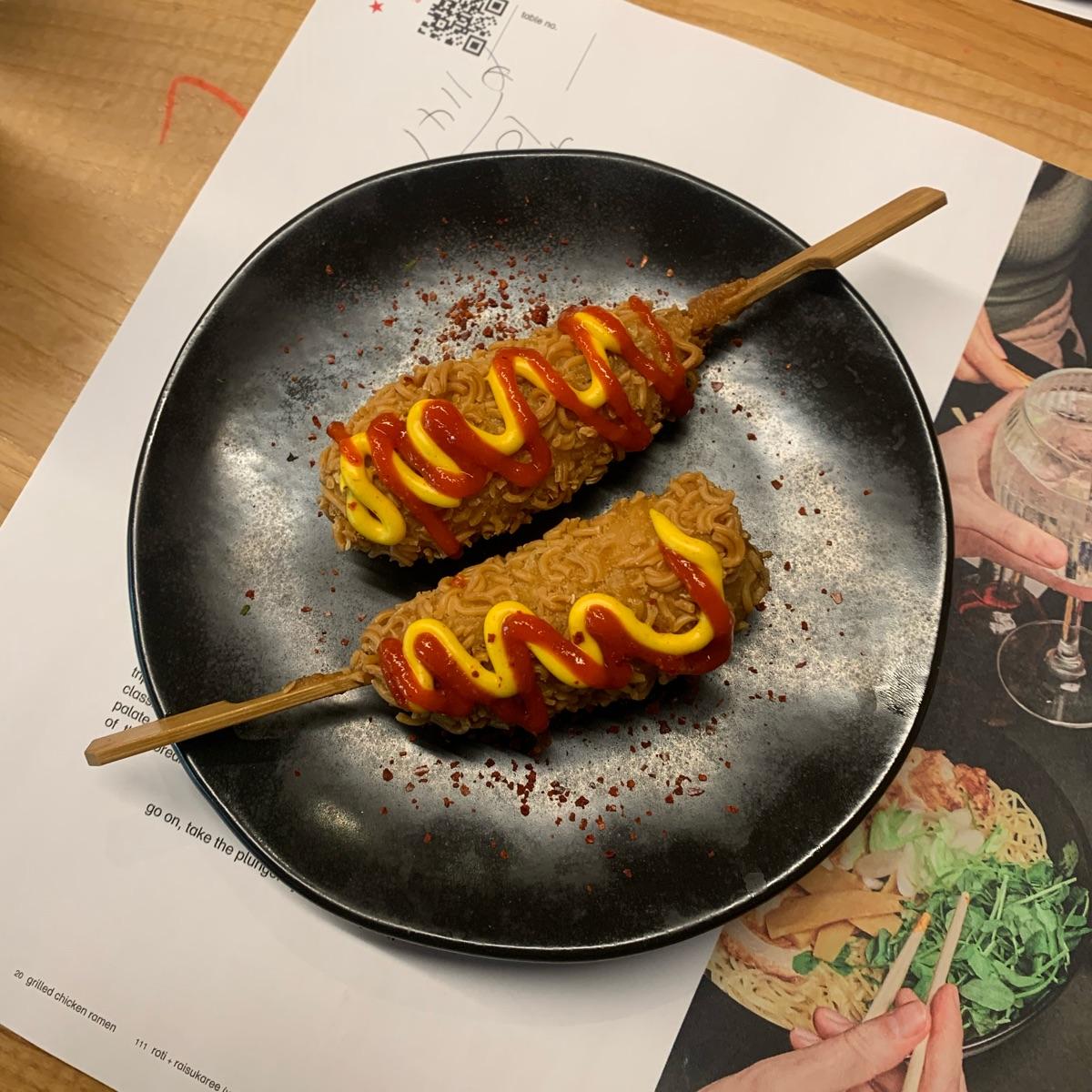 I was really impressed with these. The tumeric vegan mayo & sriracha was so tasty & the corn dog coated in crunch noodle bits was so interesting & really tasted good. Will absolutely be having this again.