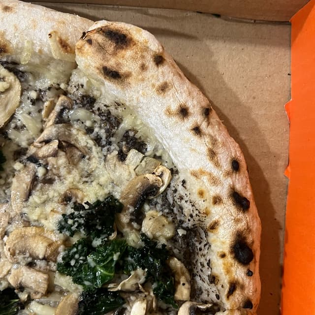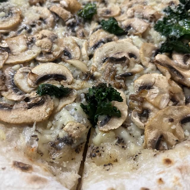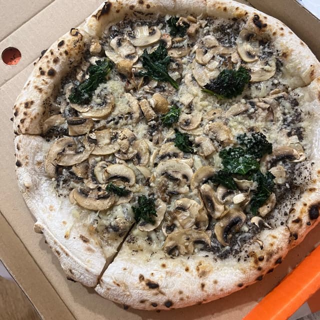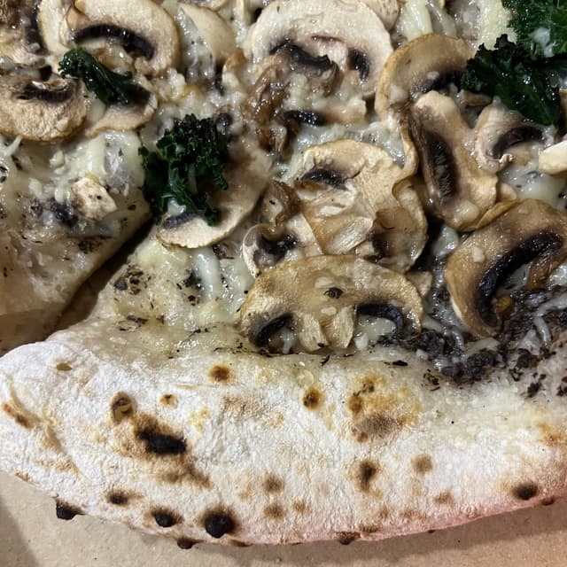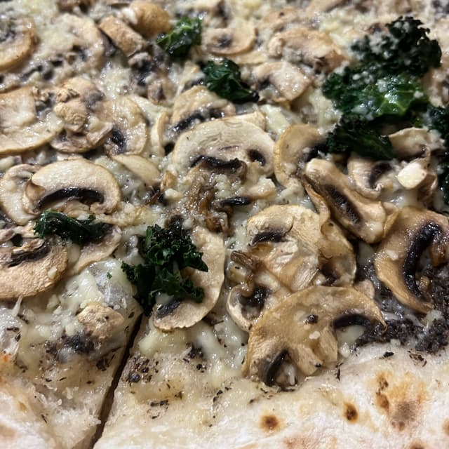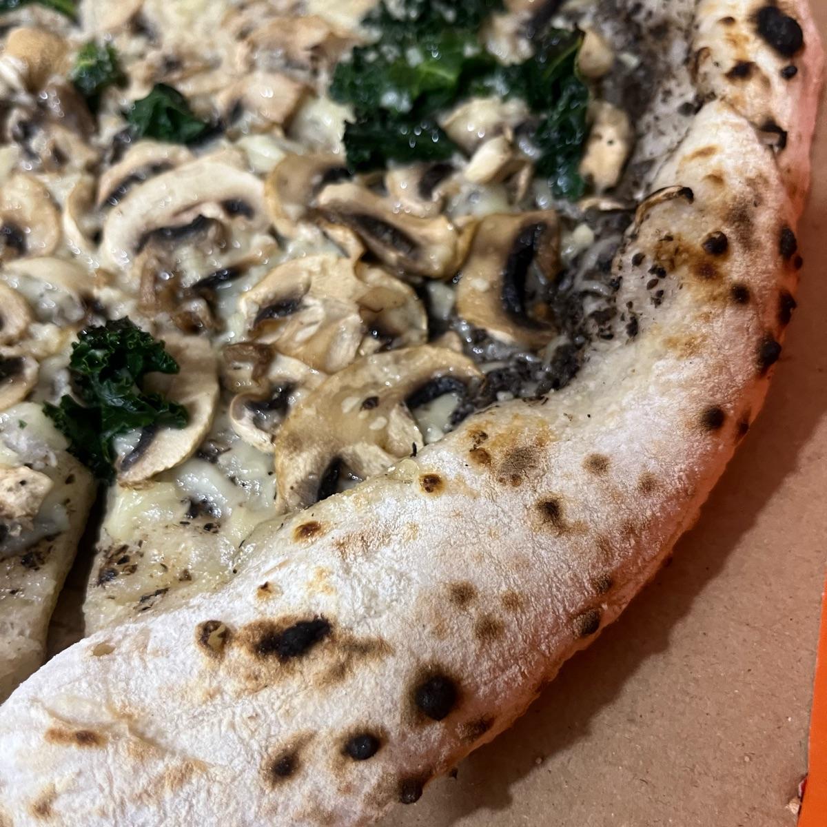 Topped with juicy and meaty #porcini mushrooms. With some #kale , #parsley, #veganmozzarella and #veganparmesan drizzled with #truffleoil on a soft,pillowy #sourdough crust.