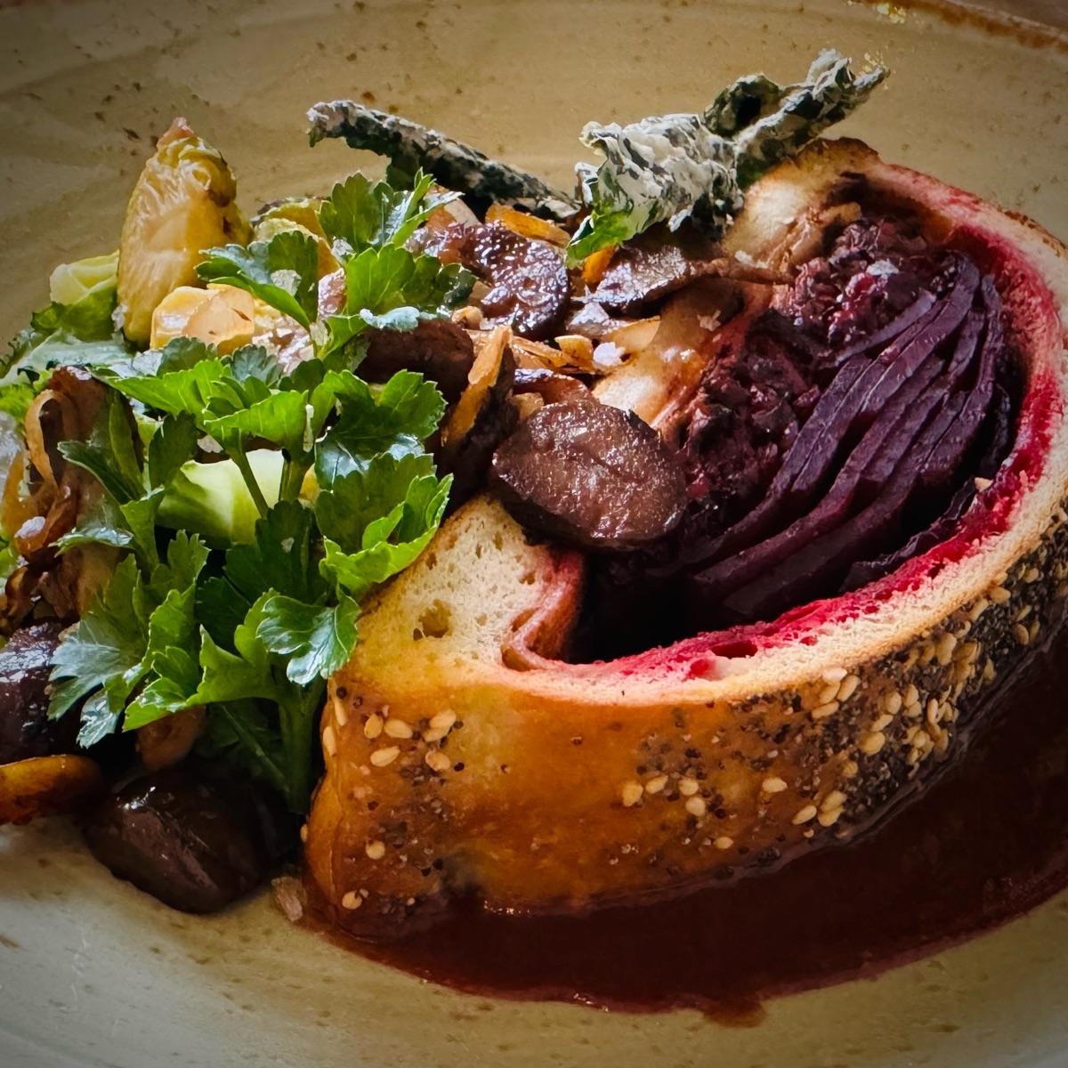 BEETROOT & MUSHROOM WELLWGTON, ROASTED CHESTNUTS, BRUSSELS, STEAMED CABBAGE, CRISPY KALE, PAN-FRIED OYSTER MUSHROOMS S RED