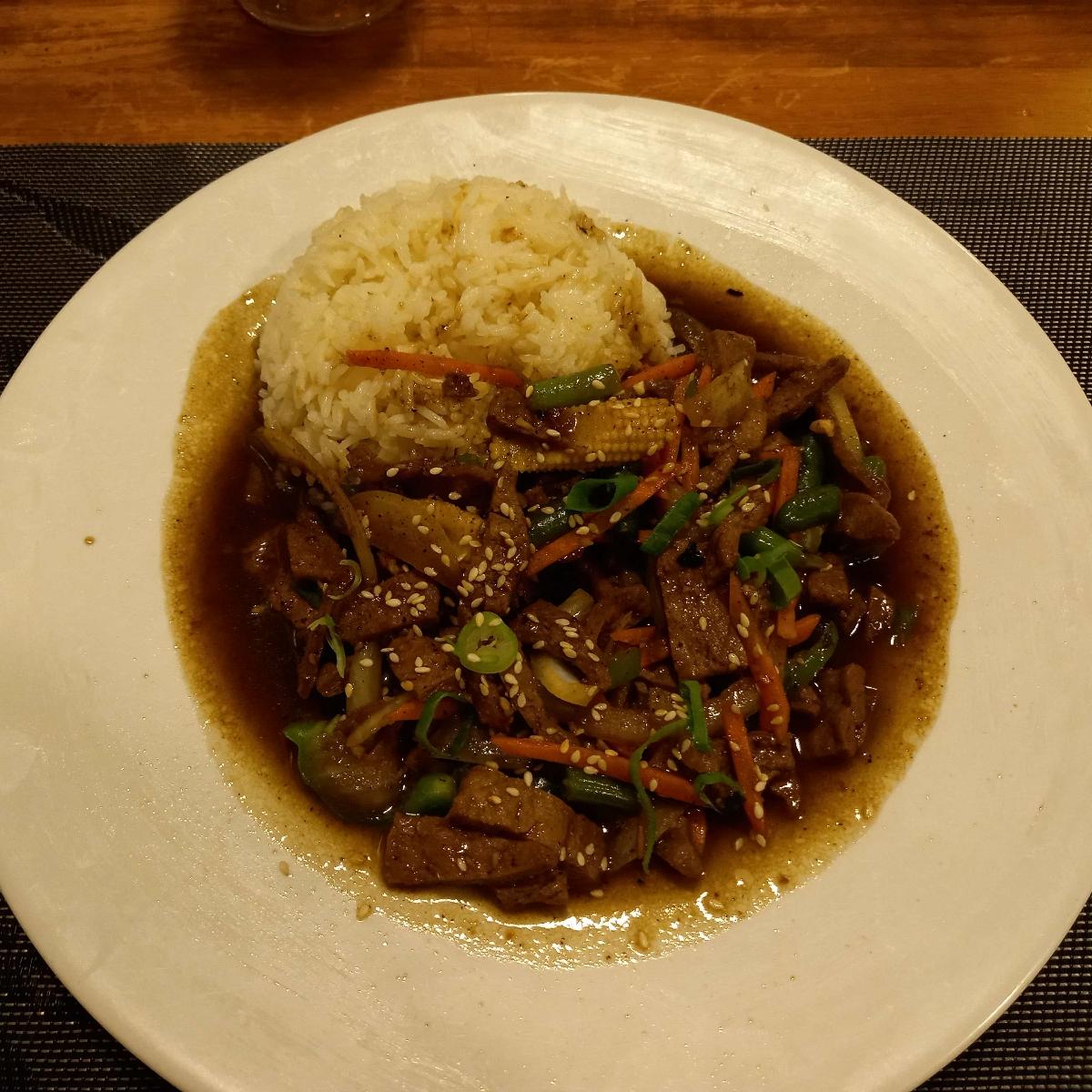 Ternera vegana con pimiento verde y arroz jazmín. Muy rico, pero el menú un poco caro.
