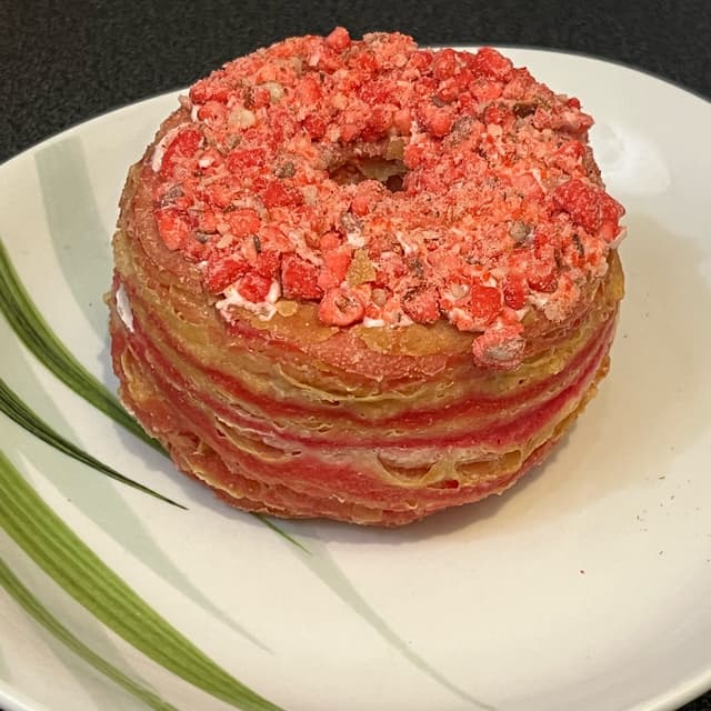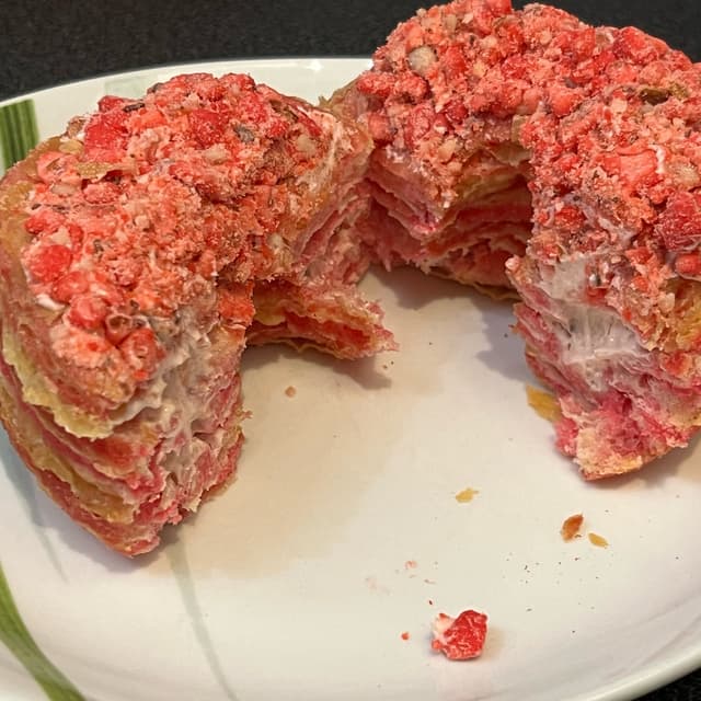 Il est fourré avec de la crème fouettée à la framboise, ce qui rend l’intérieur très moelleux et léger. La garniture du dessus avec des pralines roses aux amande apporte du croustillant.