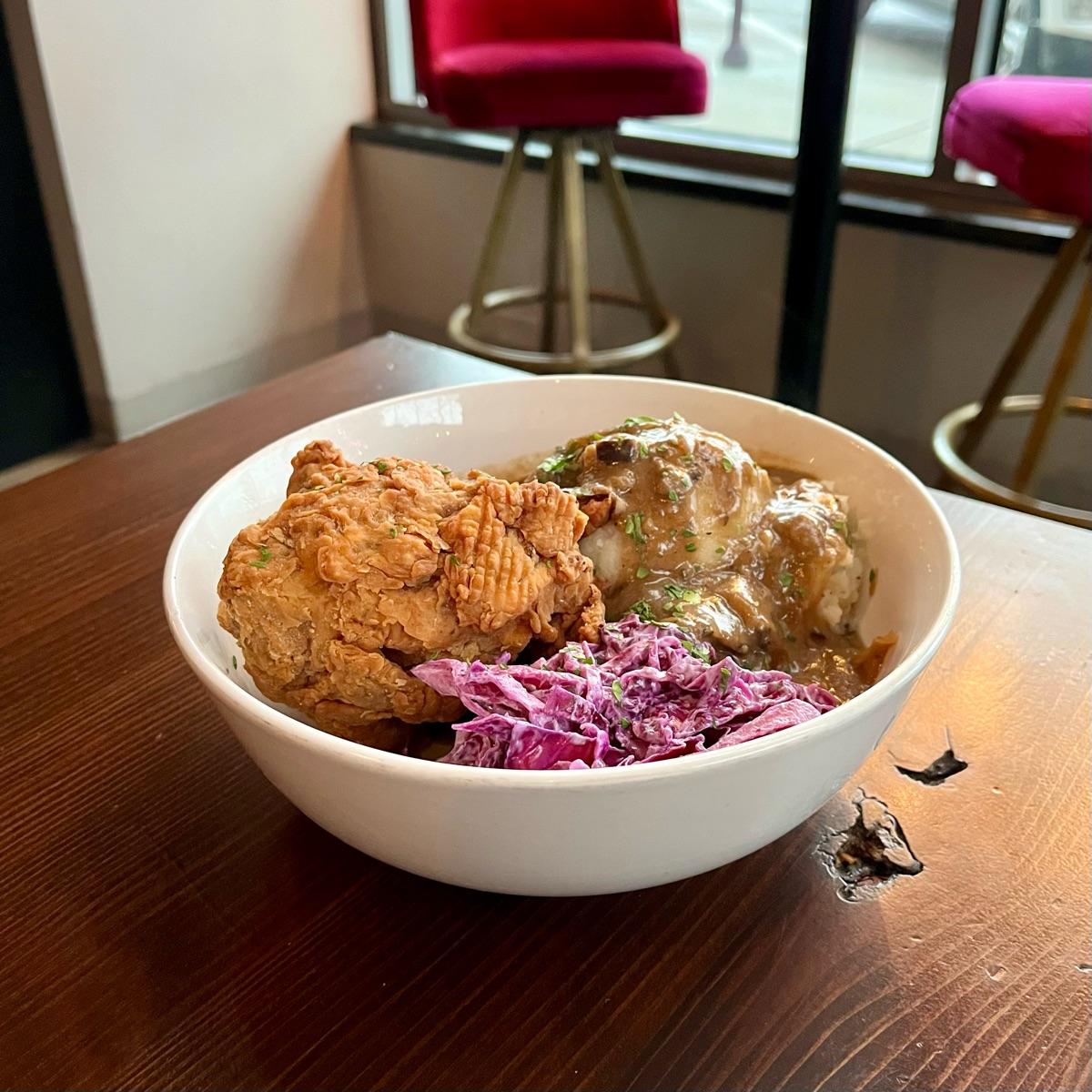SO good! This wasn’t my order, but both of the entrees we chose were so delicious that we ended up trading our bowls back and forth. #veganrestaurant This dish is described on the menu as “finger lickin' local oyster mushrooms, mushroom gravy, mashed potatoes, coleslaw, [and] chives.” The #mushroom was fried to #sweetdreamsaremadeofgrease perfection— the batter was fantastically crispy and more #crunchy than any I’ve ever experienced before, and it made the most satisfying crackling sound as I cut into it. It sat atop a bed of creamy, pillowy mashed potatoes. The umami-rich #mushroomlover gravy really tied the whole dish together — it was packed with an impossibly generous helping of mushrooms! — and the purple coleslaw contributed freshness and color.
