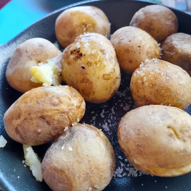 Buone, lessate con la buccia (mi chiedo se siano lavate bene, perché a volte non mi sembra, giudicate voi) e condite con olio evo e sale grosso.