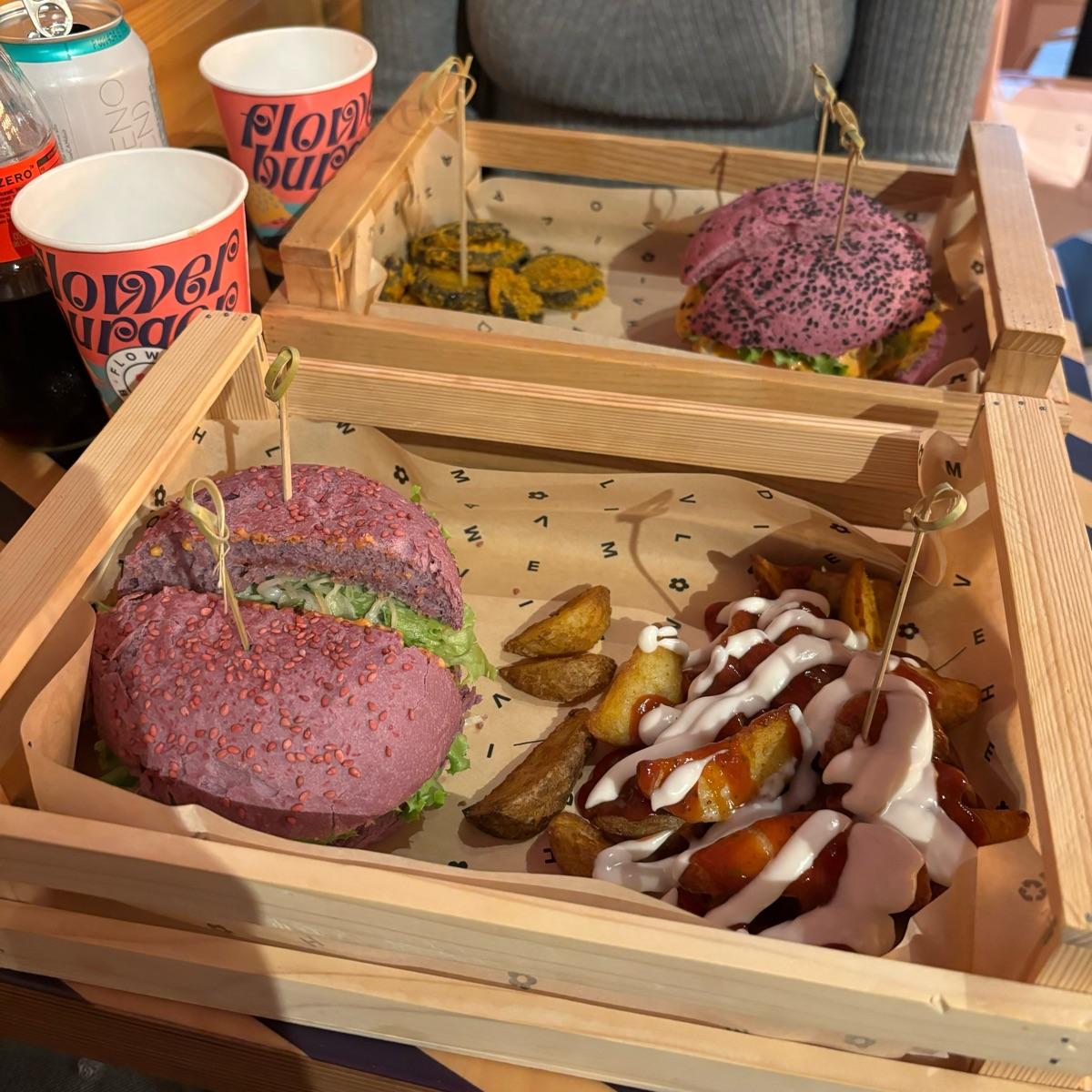“Un fiore in bocca può servire sai, più allegro tutto sembra” cantavano Battisti e Mogol. Ed è proprio questa la mission di Flower Burger, la prima veganburgheria nata nel 2015 nel cuore di Milano, in continua espansione sia in Italia che all’estero. Il fiore come espressione di positività, gioia e amore. Un legame con la natura che si declina nelle tonalità dell’arcobaleno con una proposta culinaria 100% vegan: burger la cui caratteristica fondamentale è il colore. Si passa dal pane giallo fatto con la curcuma, al viola grazie alla carota nera fino all’amatissimo rosa, ottenuto grazie all’estratto di ciliegia. Il team di Flower Burger è sempre alla ricerca di nuove colorazioni naturali e di nuovi ingredienti per stupire e colpire i nostri clienti. Jungle Burger, Flower Burger e Cherry Bomb sono solo alcune delle proposte offerte accompagnate da patate profumate alla paprika, edamame o patatas buenas. Germogli di soia, tofu, ceci e quinoa sono ormai divenuti cibi del nostro quotidiano e Flower Burger sa come abbinarli per creare un burger dal sapore esplosivo che faccia innamorare tutti. Uno concept nato dall’idea di Matteo Toto, giovane imprenditore, che ha intrapreso un viaggio alla scoperta di gusti e sapori e alla ricerca del punto d’incontro perfetto tra l’hamburger e la cucina vegana. Una volta varcata la soglia del locale si è accolti da un’atmosfera friendly che ammicca alla cultura dei “figli dei fiori”. Il locale ospita pareti grafiche colorate e psichedeliche mescolate ad atmosfere del mondo del clubbing, dando vita a un divertente gioco di luci. Un sottomarino campeggia sulle pareti a ricordarci il Yellow Submarine dei Beatles e dietro ad una tenda colorata anni ‘70 si trova la cucina, il luogo dove nascono le nostre creazioni!