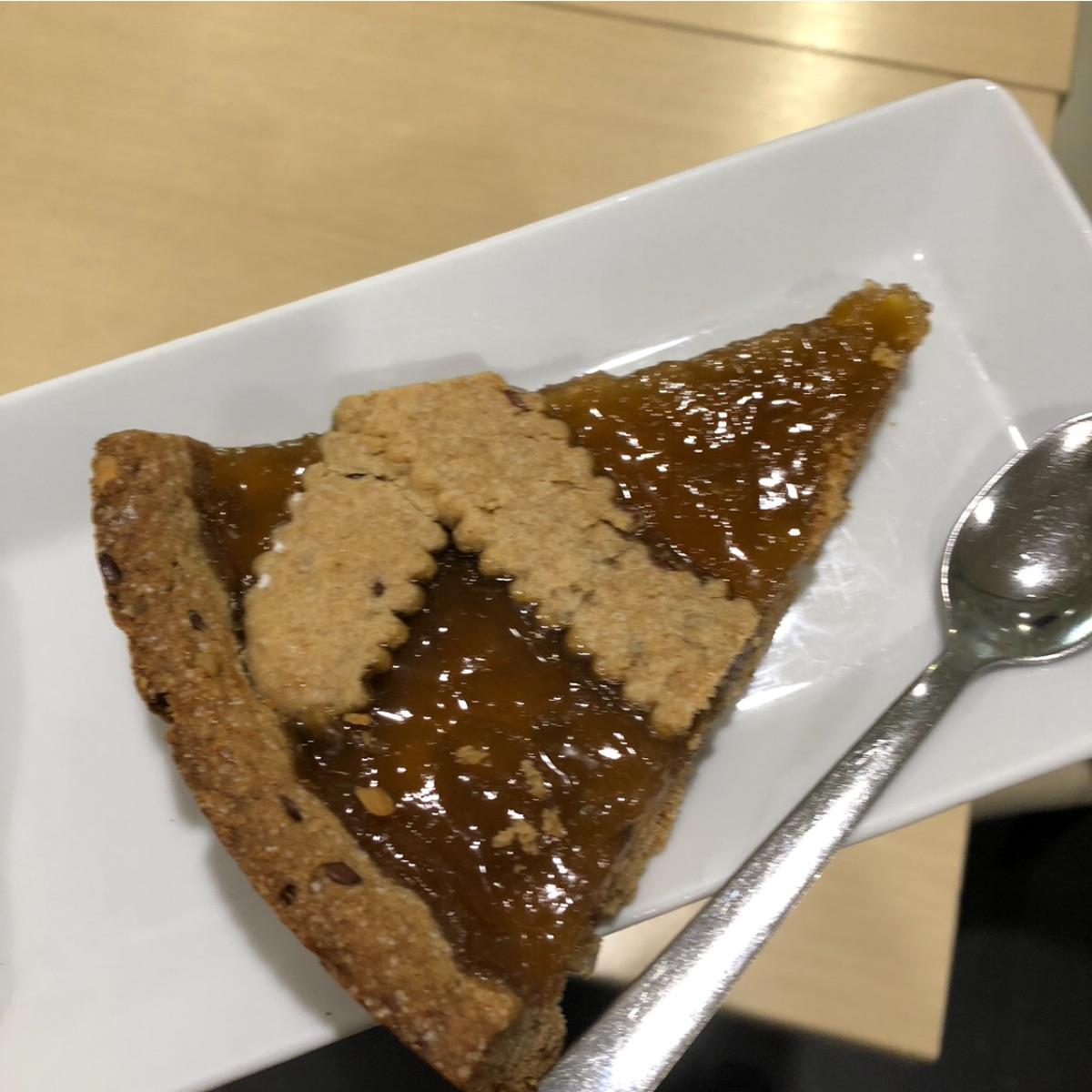 Crostata vegan con marmellata di zenzero e limone, la porzione è bella abbondante e la torta è buona, frolla solida e compatta (sembra anche mezza integrale o qualcosa del genere), marmellata non troppo dolce. Stupenda accompagnata al caffellatte. Unico problema è il prezzo, 6€🥲 mi è stata offerta altrimenti non l'avrei presa.
