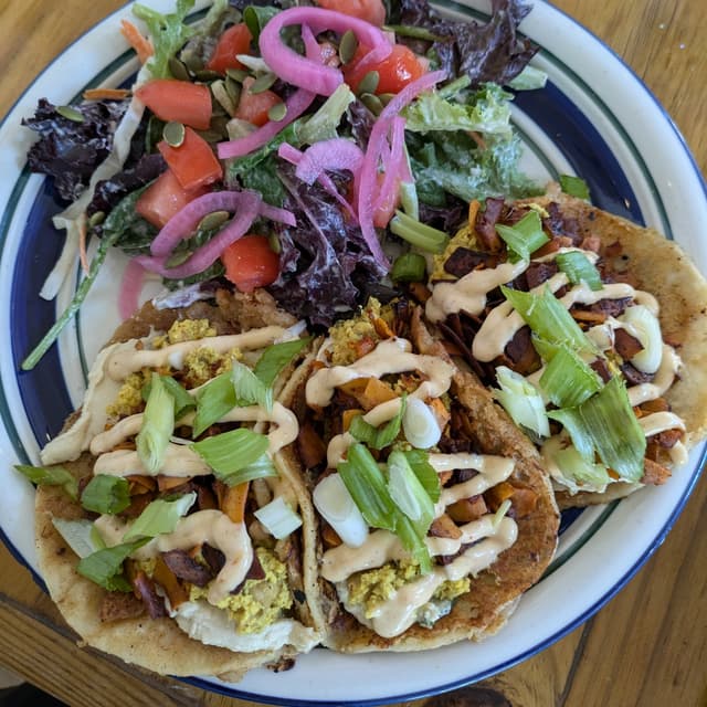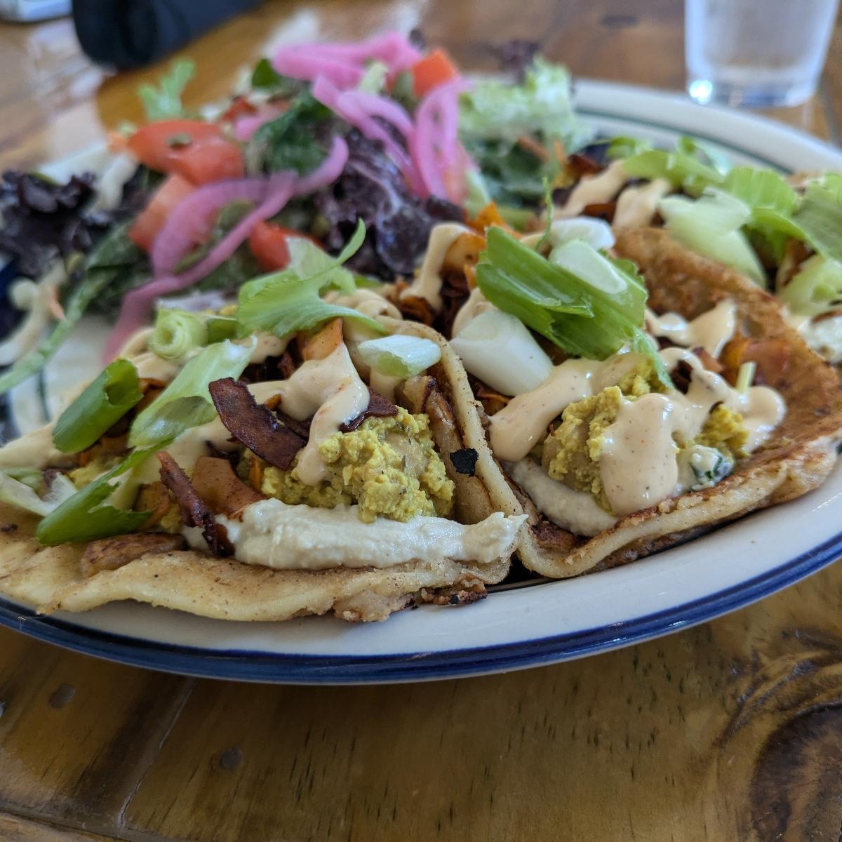 These breakfast #tacos were delicious. Description: "Corn tortillas toasted in french toast batter, topped with scallion cream cheeze, scramble, maple-dojo aioli, and coconut bacon. Served with salad or homefries." A #greatvalue at $15 - so filling! The soft battered corn tortillas were amazingly tasty, and the scramble was so well seasoned. All the different flavors and textures mixed well together.