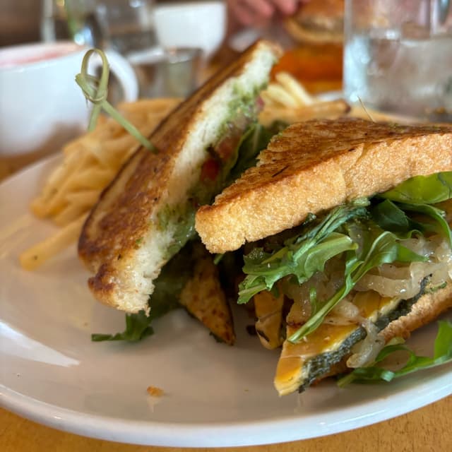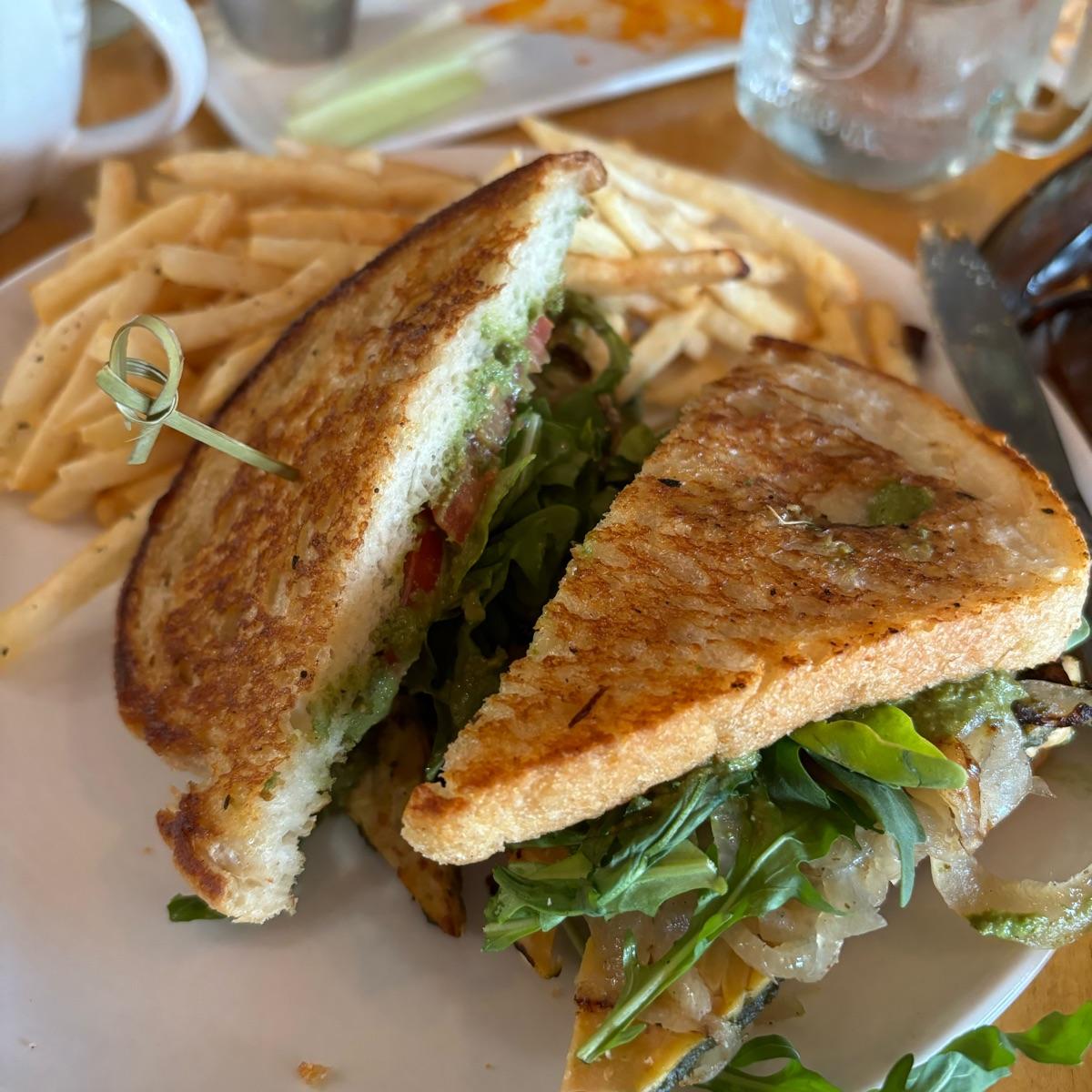 The pesto on this sandwich was fantastic! Had house-made tempeh (which I thought needed some more salt/seasoning), caramelized onions, arugula and tomato on grilled sourdough bread. And added a side of fries. Overall I enjoyed the sandwich, sourdough was the perfect bread for the sandwich.