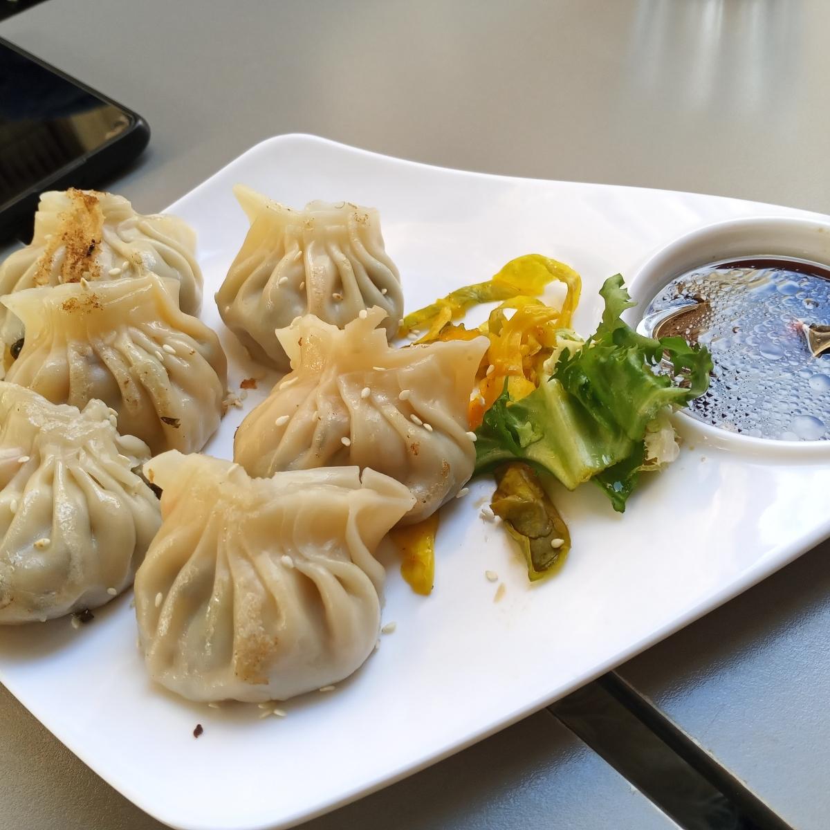Gyozas vegetales con salsa de soja. Muy buenas y muy bien presentadas. La carta de este local es aproximadamente un 50% vegana. No tiene sentido elegir gyozas manchadas de sangre, y menos teniendo en la misma carta esta opción libre de crueldad prácticamente idéntica. Incomprensible que alguien informado pueda pedir la alternativa especista, pero la realidad es que el 99% de la gente lo hace.