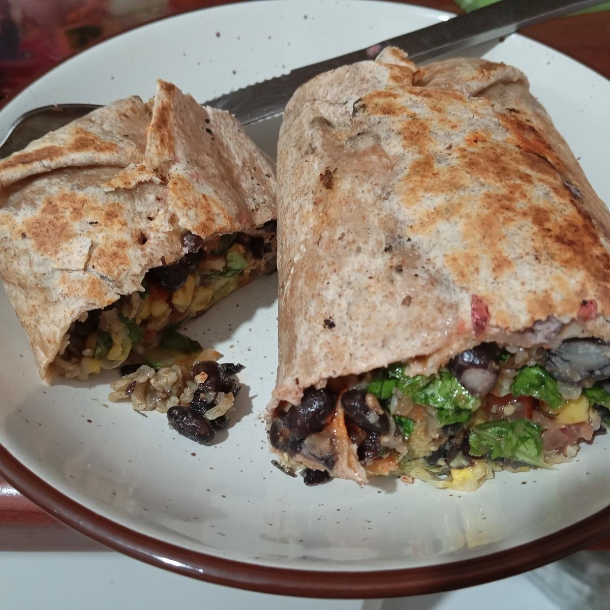 Burrito 🌯 integral de porotos/frijoles negros guisados+ arroz integral + palta 🥑 + pico de gallo 🍅🧅🌶️+ choclo y hojas verdes.