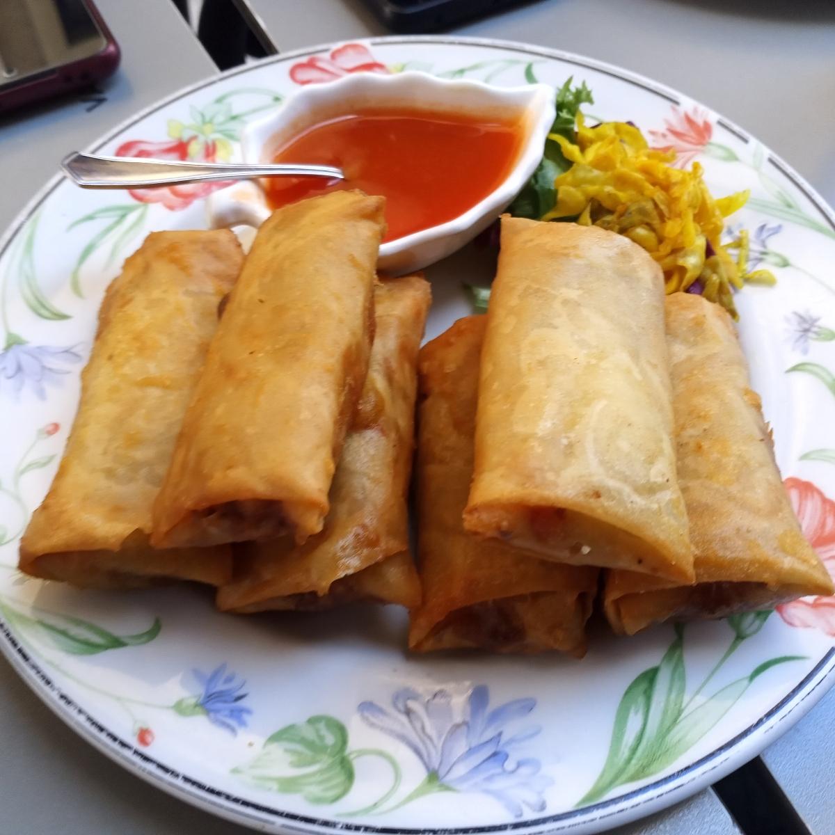 Rollito primavera vegetal. Muy rico y buena presentación, con salsa agridulce para quiera. En este local se puede comer variado y rico sin causar sufrimiento a animales inocentes. Lástima que no es vegano, sino que tiene una carta vegana, de varias páginas, incluido postres.