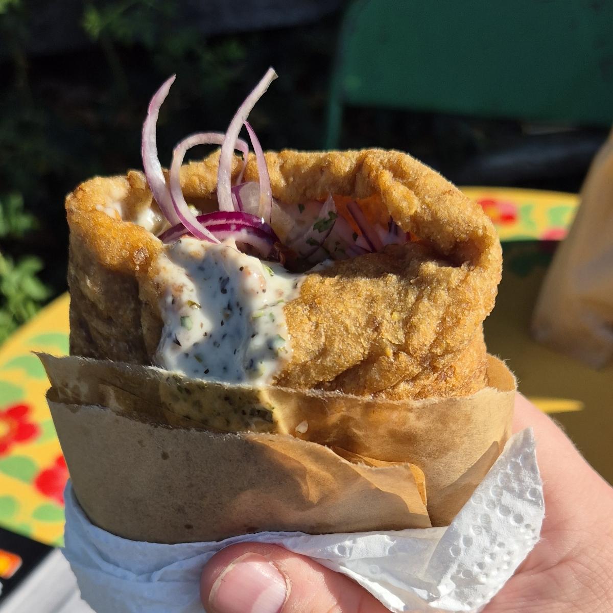 This falafel roll with fried chick pea bread was delicious. Very different from the classic rolls and with ingredients you probably wouldn't try at home. I chose a garlic sauce. Overall very delicious, and well worth the price.