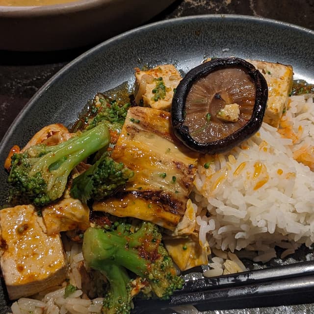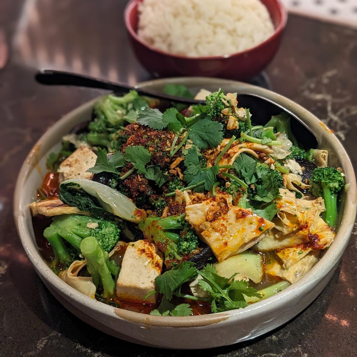 This is a great option for an entree and sharing! Unfortunately, it doesn't automatically come with rice, which is wild to me! I got a side of rice and really enjoyed it though. It comes with classic tofu and yuba. It also has bok choy, broccoli, and shiitake mushrooms. The sauce was really yummy. Although it looks intimidating with the chili bits and bright red color, it wasn't terribly spicy. It was very manageable, especially with the rice to help mellow it out and dilute the heat.