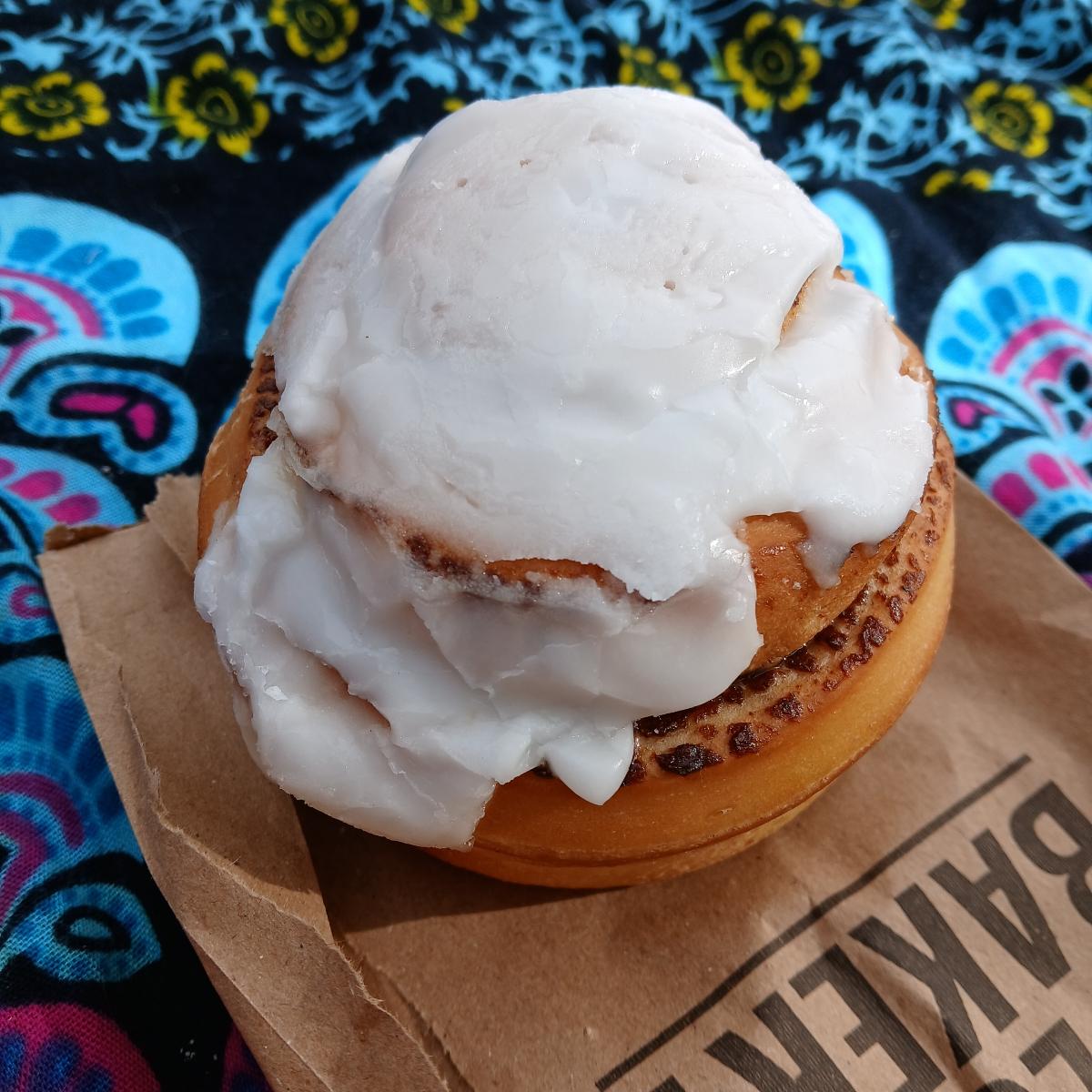 Rol de canela. Enorme, riquísimo. La canela es suave, lo favorito fue el glase, me encanto. Lo comparti con una amiga no vegana, y también le encanto. Voy a volver a comprar. #cinnamonrolls #roldecanela #veganbakery