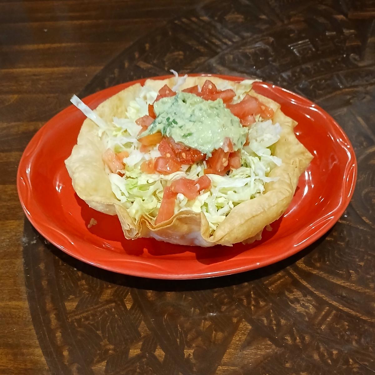 This salad bowl has pinto beans as my protein source. I made sure there was no dairy and added salsa to spice it up. #tacosalad