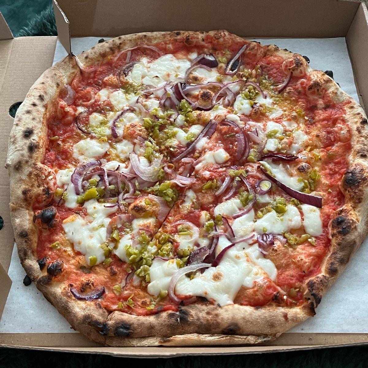 Pizza with guindilla chillis, red onions and garlic oil - relatively simple but delicious. Usually a veggie pizza, but can be made vegan by removing Parmesan and mozzarella and replacing with vegan cheese.
