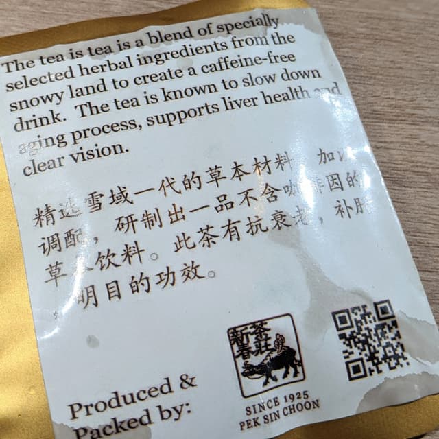 Not technically 'tea', this wellness cup is a brew of TCM powerhouse herbs like chrysanthemum flowers, black goji berries and red goji berries. Purported to slow ageing, support liver health as well as eye health. Surprisingly this was also packed by legacy tea merchant Pek Sin Choon for Lian Xin.