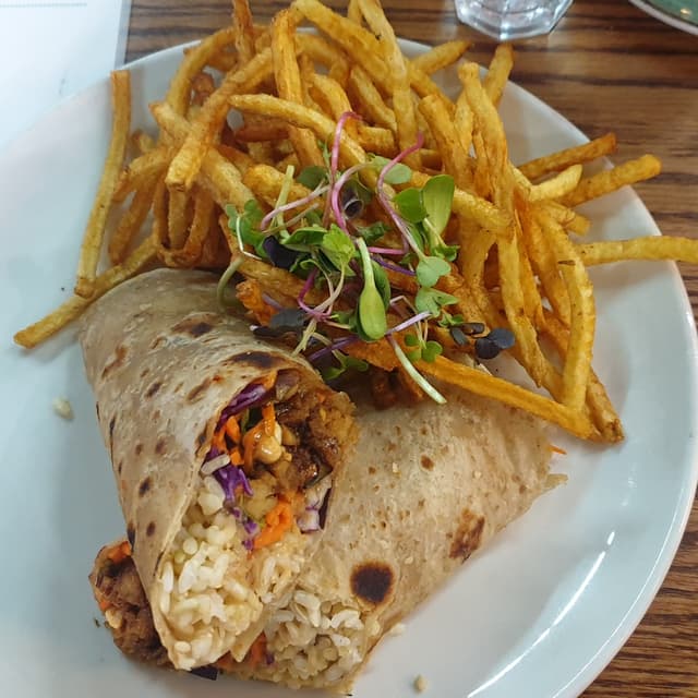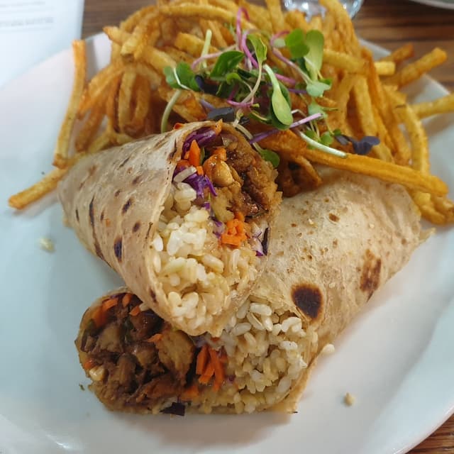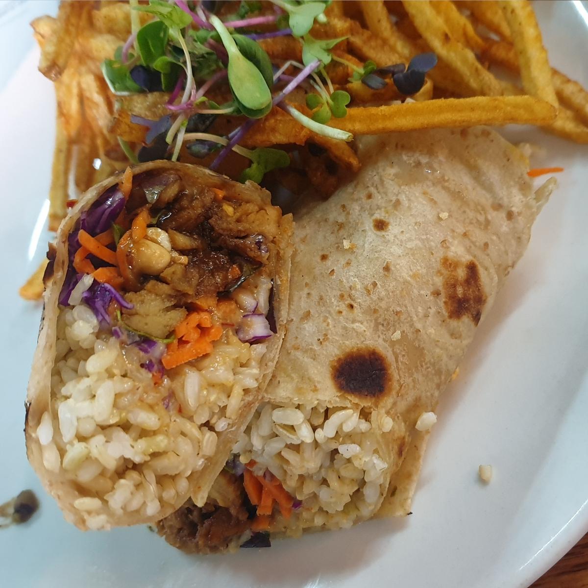 I'm so pleased I had decided to try out this wrap. It was generously filled with yummy ingredients such as satay sauce, plant-based ch!cken, cabbage, carrot, brown rice and peanuts.