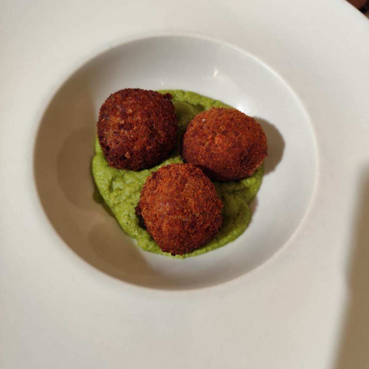 Polpette fatte a mano e fritte, con granulare di soia, con crema di pane al latte di soia, farina di ceci, aglio, coriandolo, paprika forte, pepe nero, prezzemolo e pinoli, In salsa di piselli. Leggermente asciutte ma accompagnate con la sal da di piselli, sono molto gradevoli