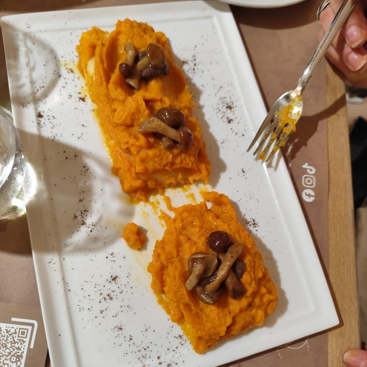 Ravioloni di pasta fresca lavorata a mano, ripieni di ricotta di noci Macadamia, crema di zucca e pepe bianco, Demiglaces di verdure, funghi con peperoncino Habanero. Insomma una delizia per il palato, andate a provarli