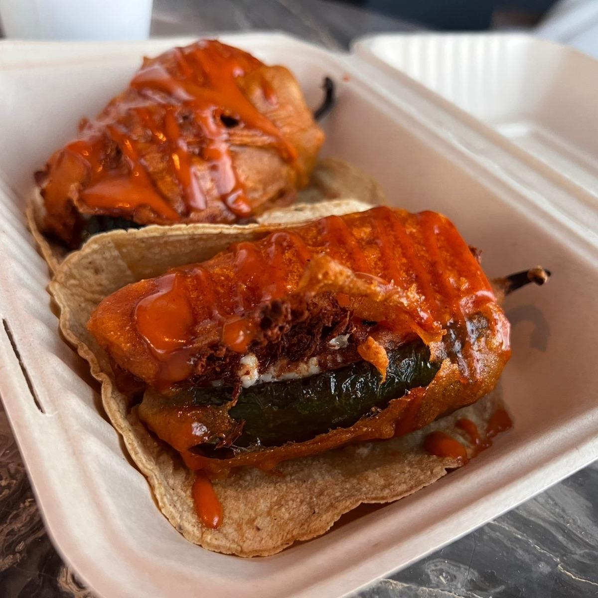 What a bomb idea! Battered jalapeño #pepper stuffed with #plantbased seafood stew with #cheeze in a tortilla with chipotle sauce 🫑 spicy, but not too much, and just a genuinly fun mix of textures and tastes. Only in #Mexico !!🇲🇽