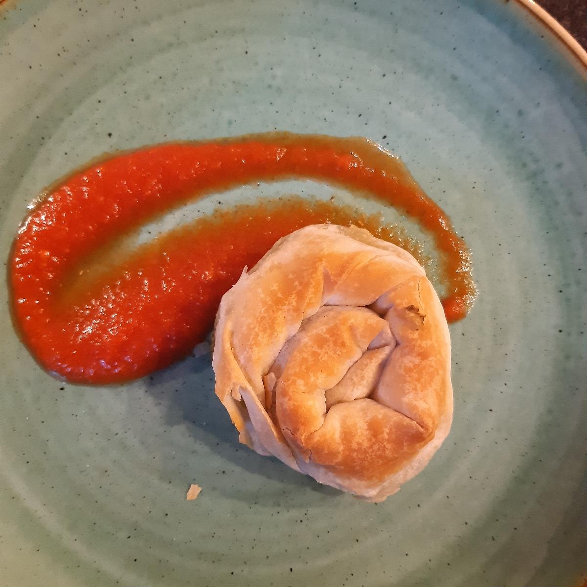 Praticamente è la spanakopita greca ripiena di ricotta di mandorle e spinaci, con una salsina di pomodoro alla base. Ottima!