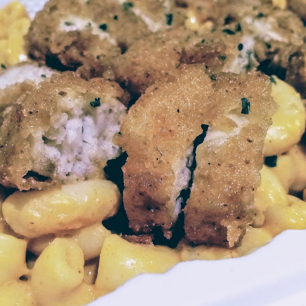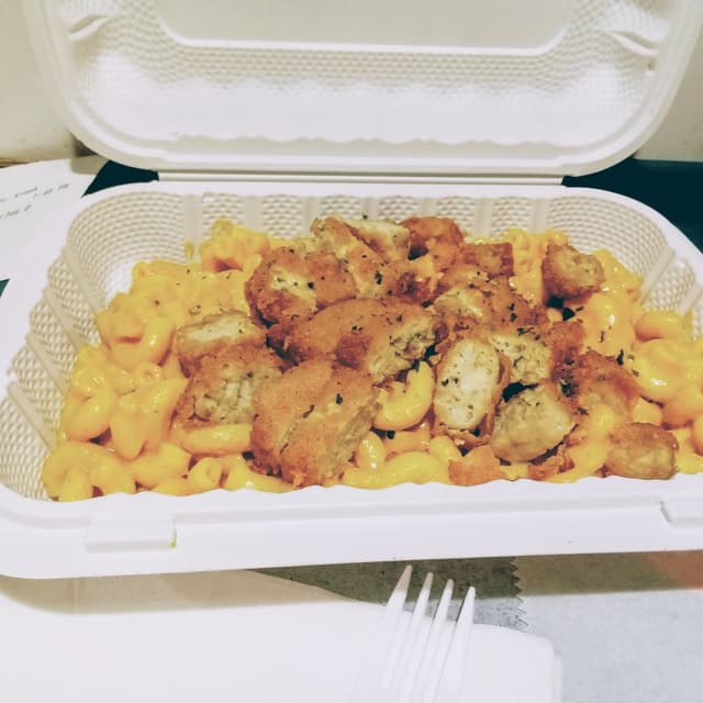 Restaurante de comida rápida. Plato de pasta tipo macarrones con queso vegano derretido (😋😋 muy rico!) y encima beyond tipo pollo crujiente y frito. También llevaba una salsa ranchera.