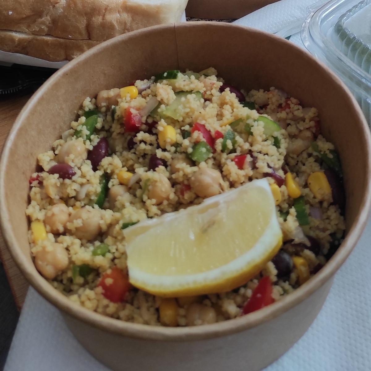 Insalata di cous cous con legumi e verdure. Leggera e buona, ideale per un pranzo al mare. Opzione vegetale in un bar sulla spiaggia molto particolare e carino.