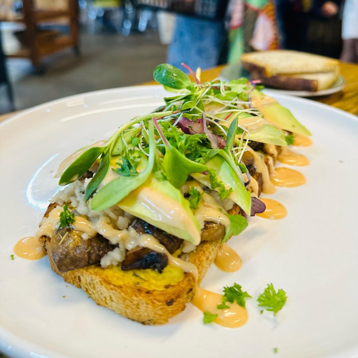 Mushroom melt- need to change the cheese to vegan cheese. Has avo, thyme and their famous pink sauce! Was yum! 😋 💚💛🌱
