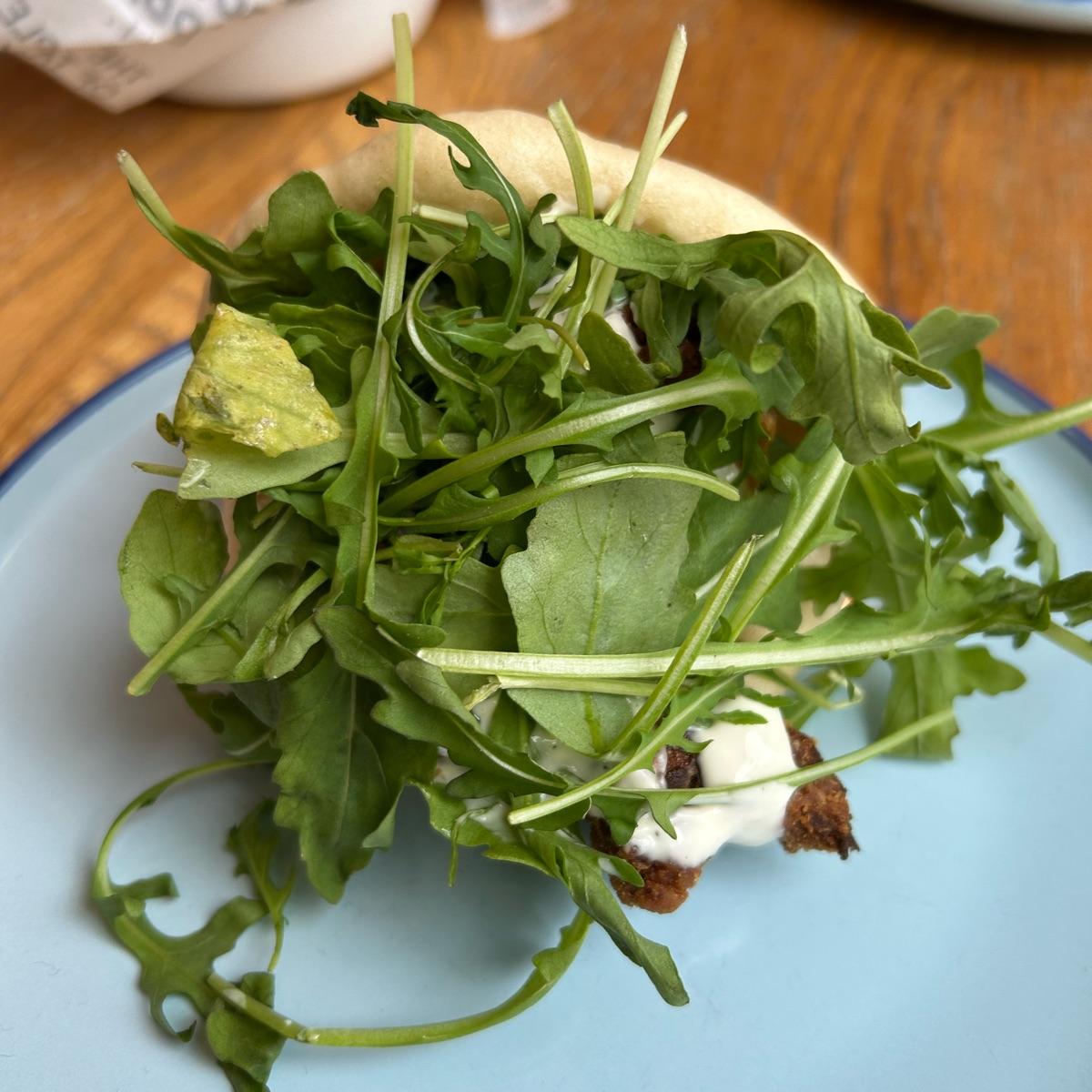Lol the arugula has taken over! Underneath all that green is a big chunk of vegan fried chicken and a yummy lime-mayo dressing. This bao was simple but really delicious. The dough is light and fluffy and the filling was so crunchy. 8.90€