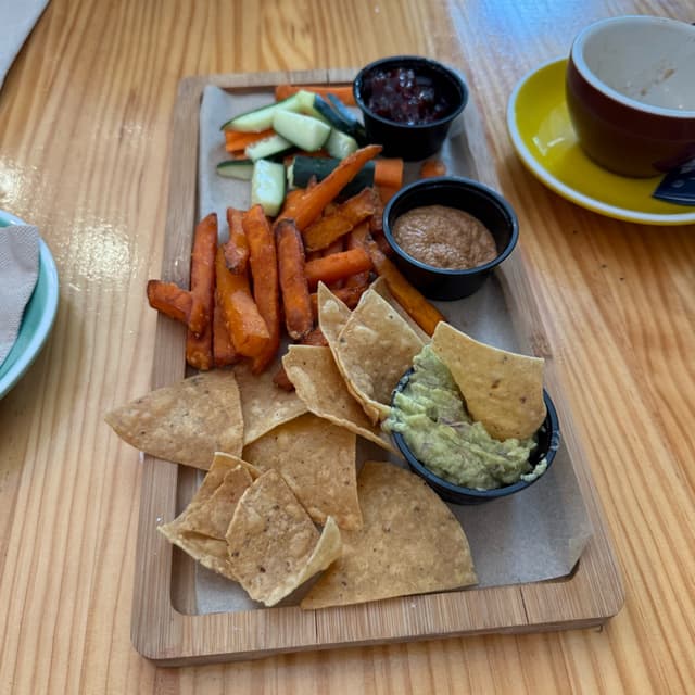 Jenny2,169 reviewsThis was a very unique #appetizer! It was €7,30 and included veggies, sweet potato fries, and tortilla chips, with a really tasty romescu sauce, guacamole, and chutney! #jenandryesagavemoonTabla Especial Aguacate