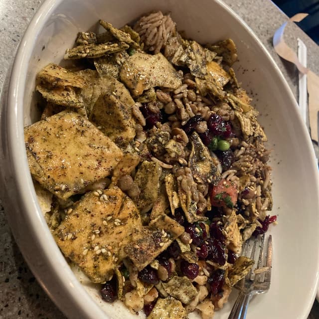 This salad is everything a power salad should be! Very light and vibrant with a nice crunch! Lebanese salata, diced squash and zucchini, peas, seasoned pita chips, walnuts, cranberries, and special seasoning tossed in Aladdin’s dressing and sprinkled with parsley. Very good and affordable!
