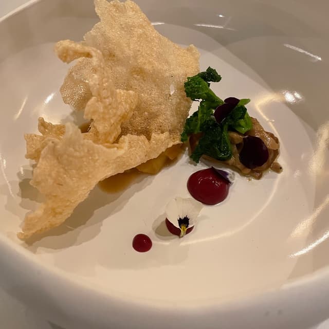 Entrée vegano propostomi, chips di platano fritto con una tartare di pomodoro e una salsa al basilico, buono, sapore delicato, ottime consistenze.