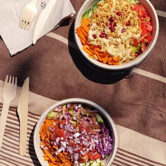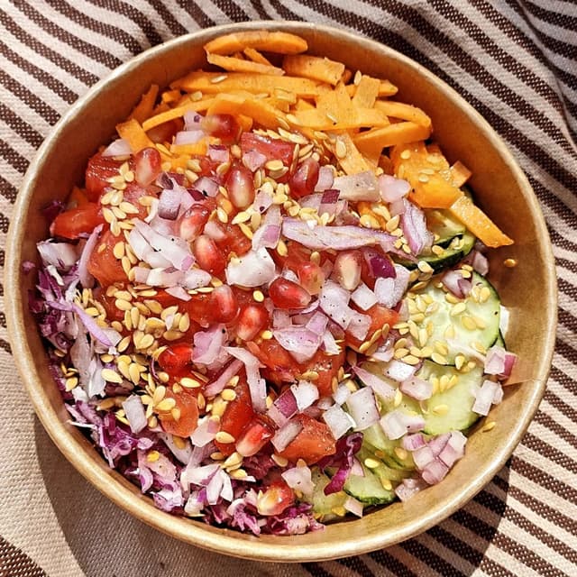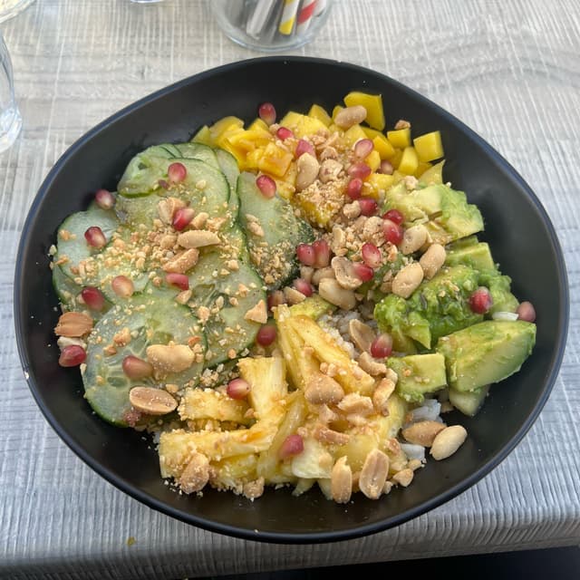Very nice poke bowl. You can choose the ingredients you prefer; in my case: rice, sweet soya sauce, hummus, carrots, courgettes, avocado, red onion, cabbage, pomegranate, fried onions and peanuts.