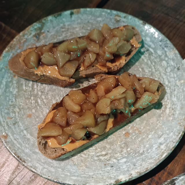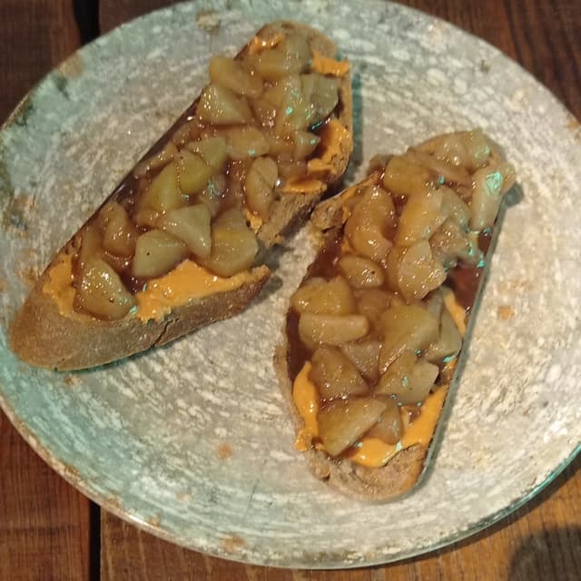 Monica1,327 reviewsTostada de centeno con crema de cacahuete y pera caramelizada por encima. Se sirve como postre. Está muy rica.Tostapera