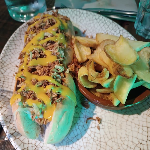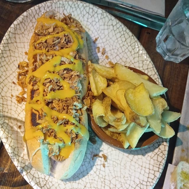 Monica1,327 reviewsBocadillo de salchicha frankfurt con cebolla, chukrut, mostaza y mayonesa. Acompañado de patatas fritas. El bocadillo es muy grande y está tremendo.Sauerkraut Hot dog
