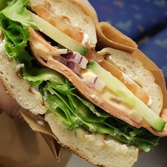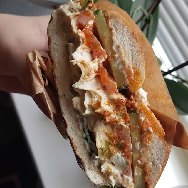 Meat free schnitzel in a bagel. Yum!! Warm bread and schnitzel, and the rest is cream cheese, veggies and béarnaise sauce (but we choose chili mayonnaise instead). Delicious!
