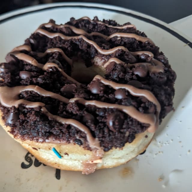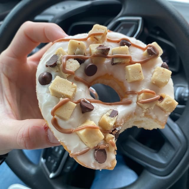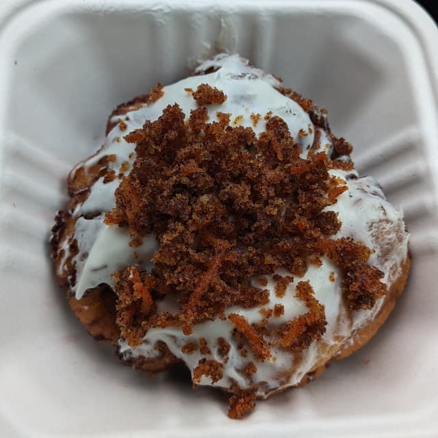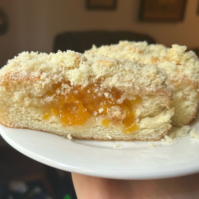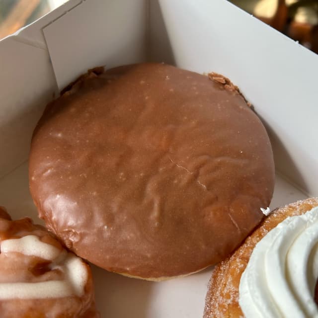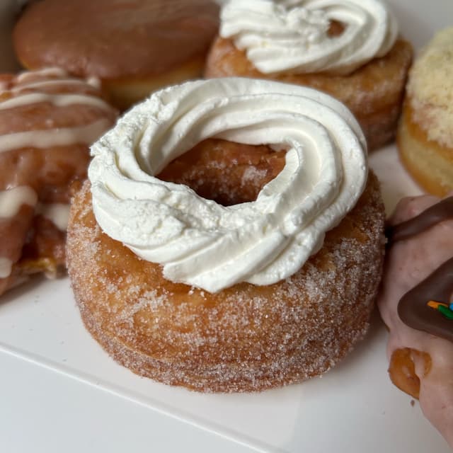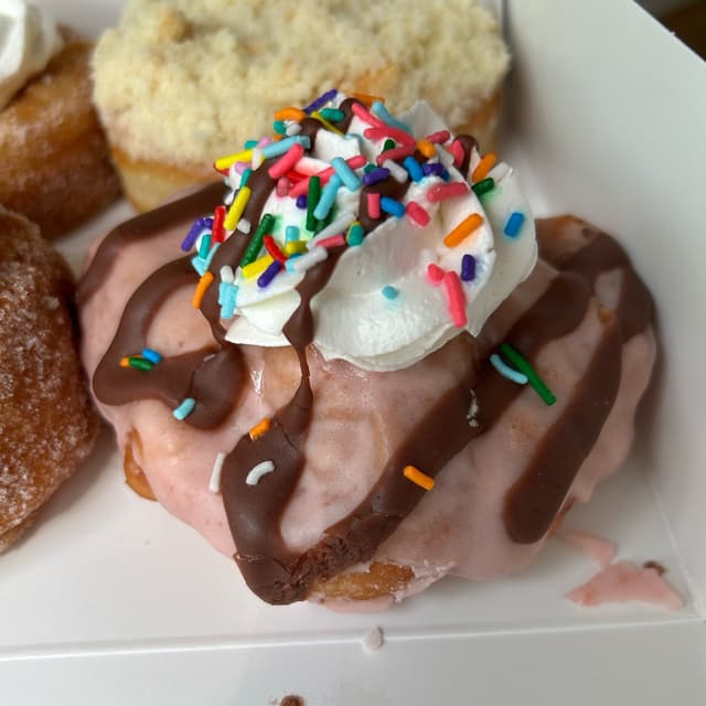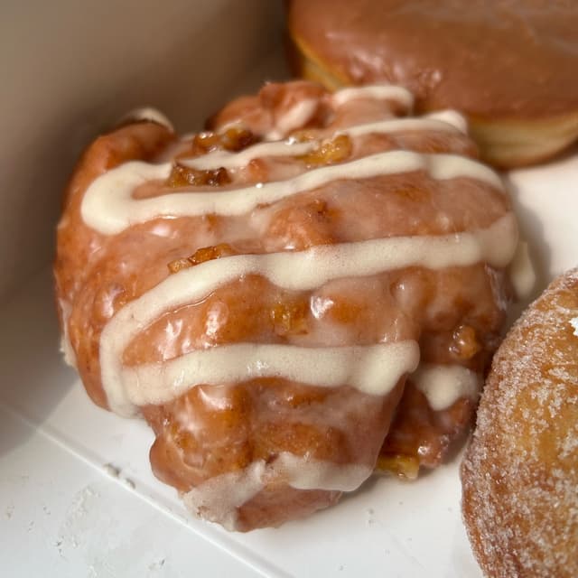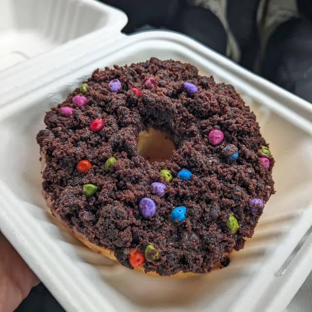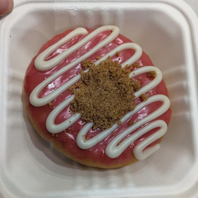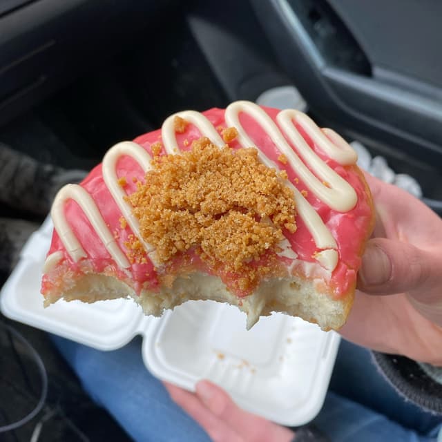 The last donut we tried! This one was stuffed with gooey and jammy peaches inside a soft and cloud like dough, topped with a crumble that resembles a pie topping. Definitely one of the best we tried. The peaches just made it feel so summery and bright!