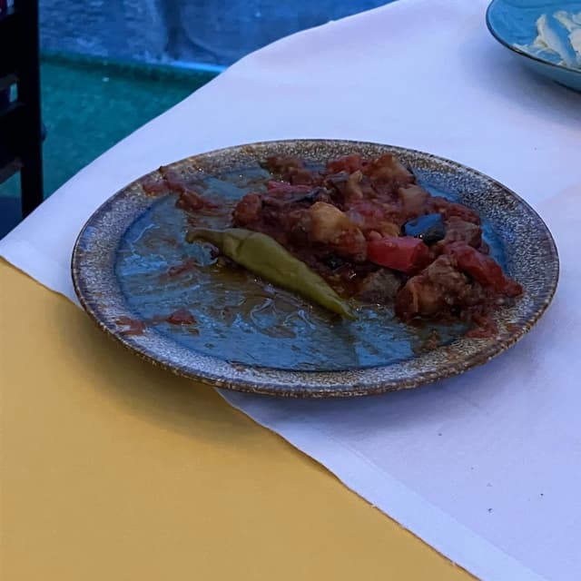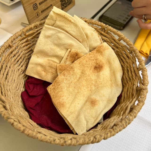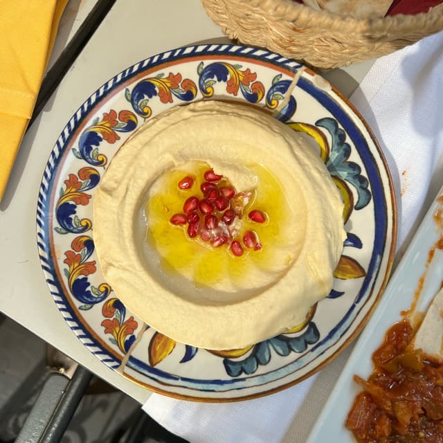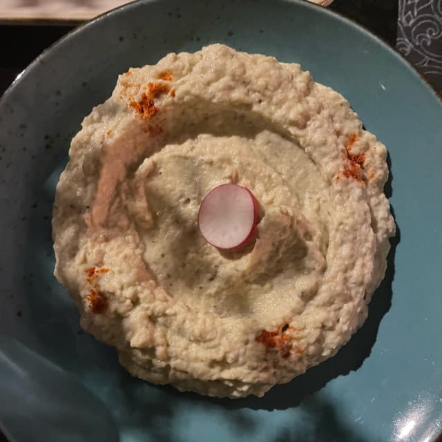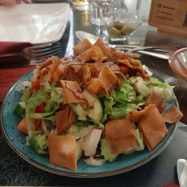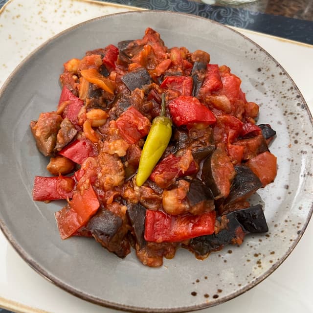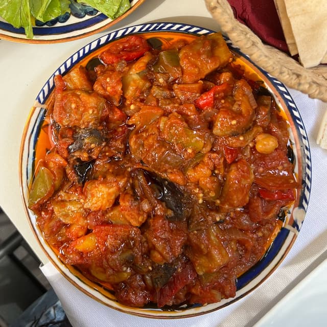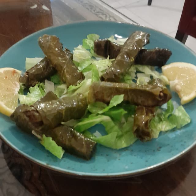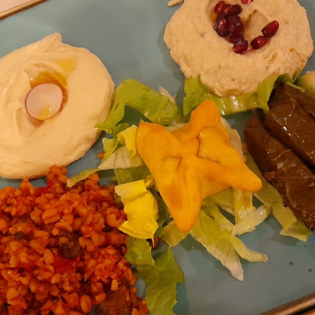 Comprende: hummus di ceci, babaganoush (una crema di melanzana, taina e limone), bulgur al pomodoro con verdure miste, involtini di foglia di vite con riso e spezie, un fagottino con verdure amarognole.