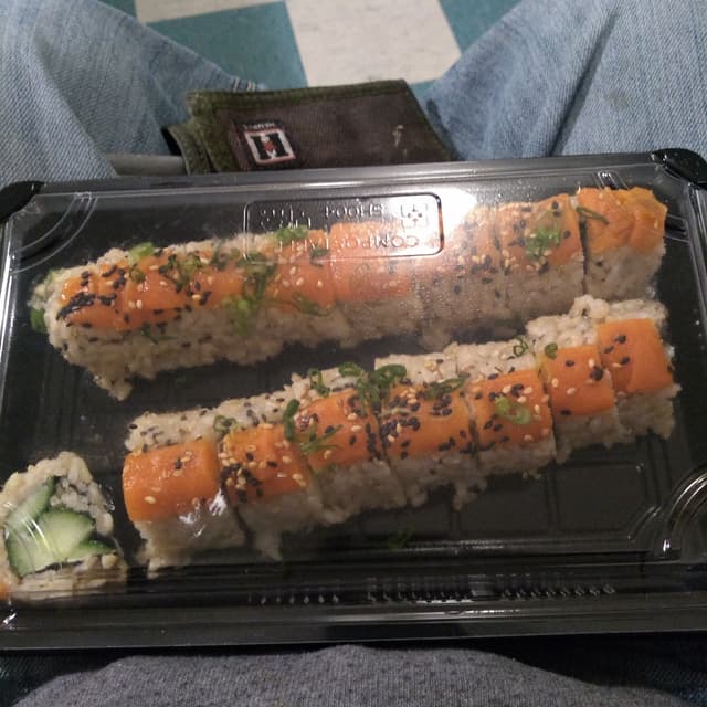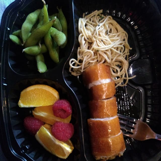 It consists of Cowgirl vegan Maki (5 rolls), edamame, sesame noodles, and fruit (oranges and raspberries) all for $6!