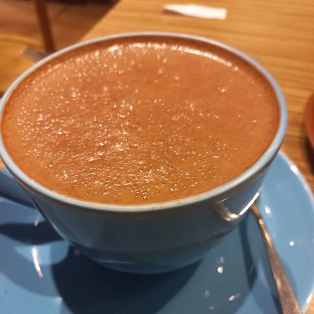 Alex166 reviewsRiquisimo. Chcolate es preparado en el lugar súper chcolatoso se prepara con leche de almendras pero se siente muchisimo el chocolate y el tamaño de la taza es súper grande. No pude terminarlo. El precio excelente. 10/10. #chcolatecaliente #veganChocolate Caliente