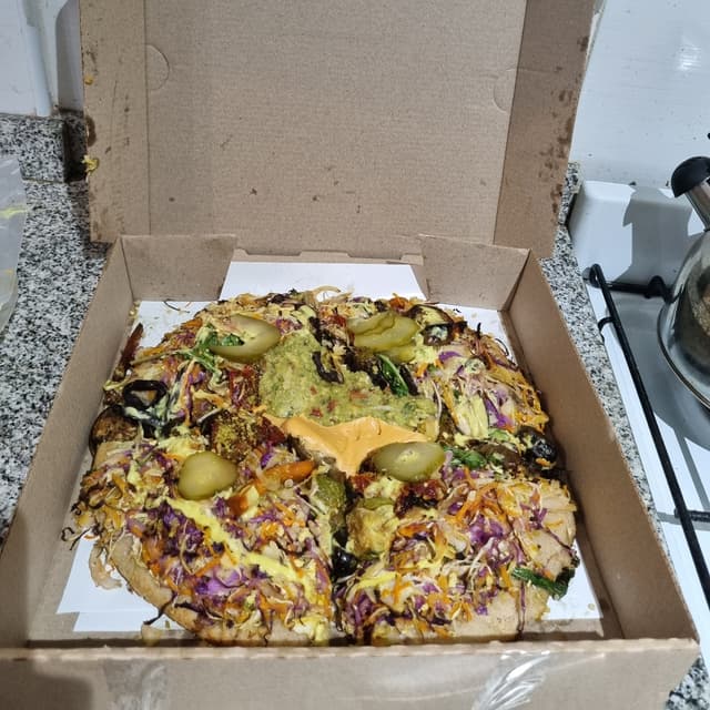 Vero360 reviewsEs una muy buena idea, es una pizza con muchísima verdura y arriba guacamole y queso de caju. Antes era más rica, le faltó sabor a las verduras salteadas, vino con poquísimo queso de caju. La masa es integral no tiene gusto a nada, no está bien lograda. igualmente es una muy buena opción. Sale 8200.-Power pizza vegana