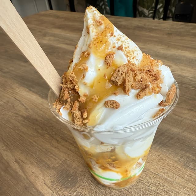 Coconut soft serve topped with (possibly smashed) banana, caramel and biscuit crumbs. A good sweet combination with the biscuit crumbs adding a little crunchiness as a bonus :)