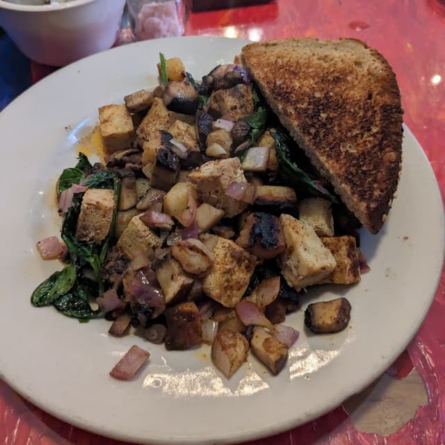Nice to find a vegan breakfast option near the New River Gorge. The tofu isn't really scrambled and this definitely isn't my favorite tofu scramble I've had but it's a good filling option
