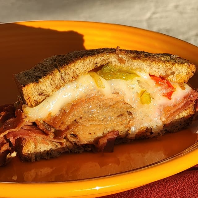 This Radical Reuben sandwich is incredible! Beautiful marbled rye bread bookends onions, peppers, sauerkraut, and a generous helping of corned beef-style seitan. The filling is piled high, and can be topped with vegan Teese cheese (highly recommended).