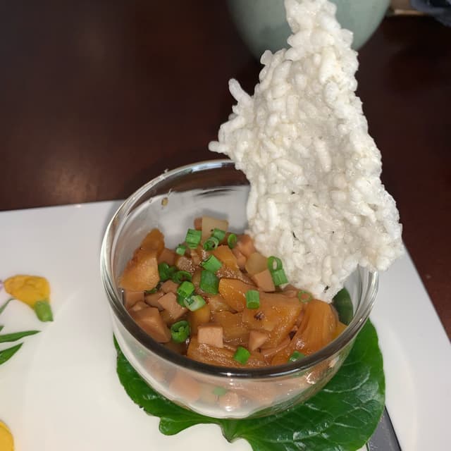 janscaz660 reviewsGreat sweet way to kick off the 8 course meal! Lovely coconut on top . At this point you are starving so you eat it fastPickled Bamboo Shoots Salad