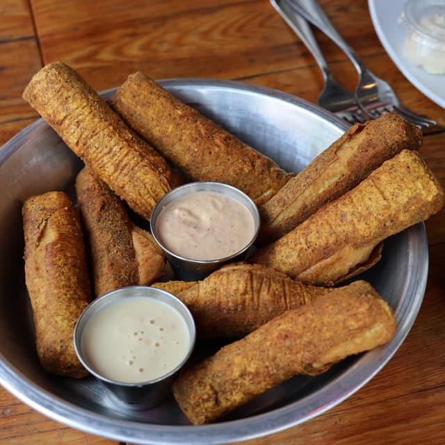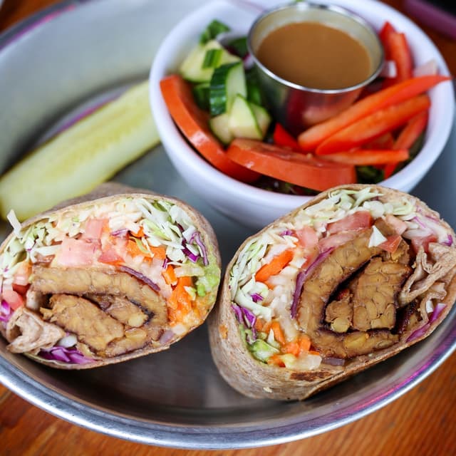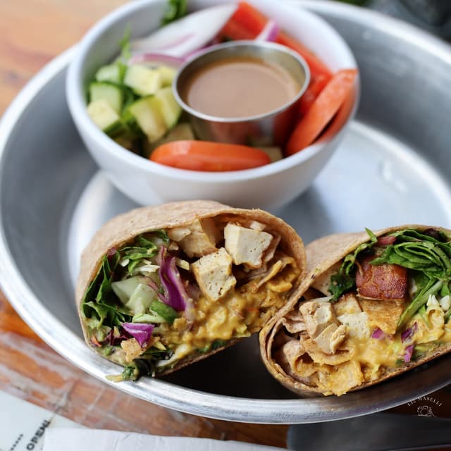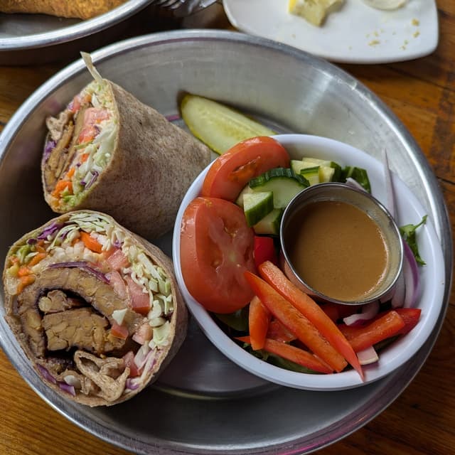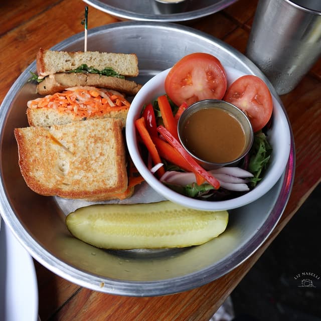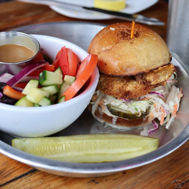This is another unique and really good option at Detroit street filling station. This seemingly chicken Patty is actually made from mushrooms. They're're fried, breaded and crispy and somehow still juicy. They're served on soft housemade Hawaiian buns with a really creamy, crunchy, slaw and #vegan yum yum sauce. It also comes with a side a bread-and-butter pickles. It's usually served with Potato Chips, but you can upgrade to a salad as well. This had loads of flavor and was it actually really really cool option. I really like the option of having #Mushroom instead of fuax meats and it is actually good for people with allergies as well. There's a lot of people who say they want to be vegan, but they can't eat a lot of soy or gluten, so mushrooms make a really good alternative. This was definitely really creative, and had a lot of flavor. The mushroom had some cajun- like spice. Everything at Detroit Street seems really pretty reasonably priced. This was about thirteen dollars with a three dollar upgrade for the salad, so a great #value #veganisnotscary #abillionlove #vegan #womenowned #recyclable