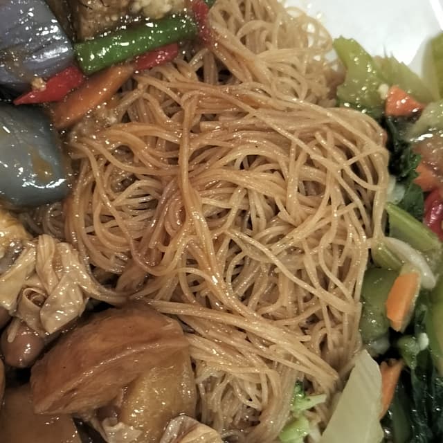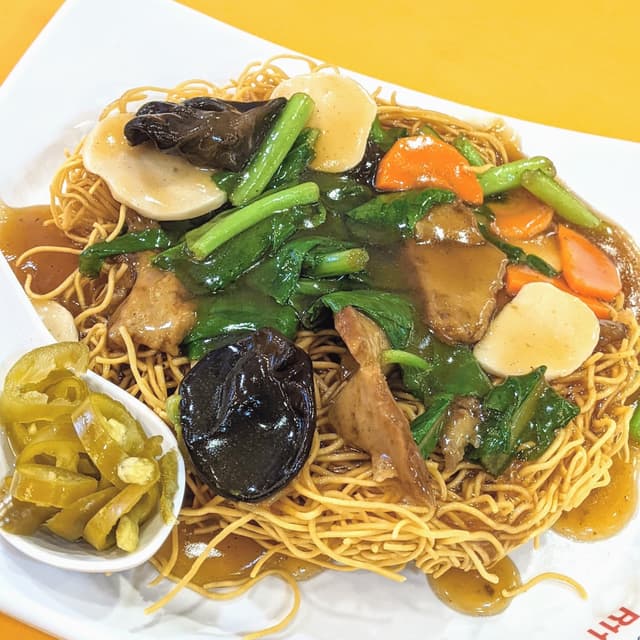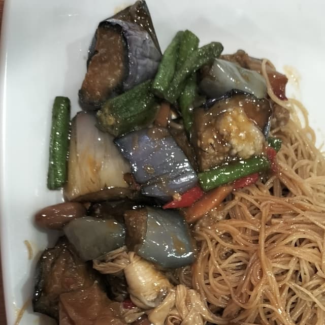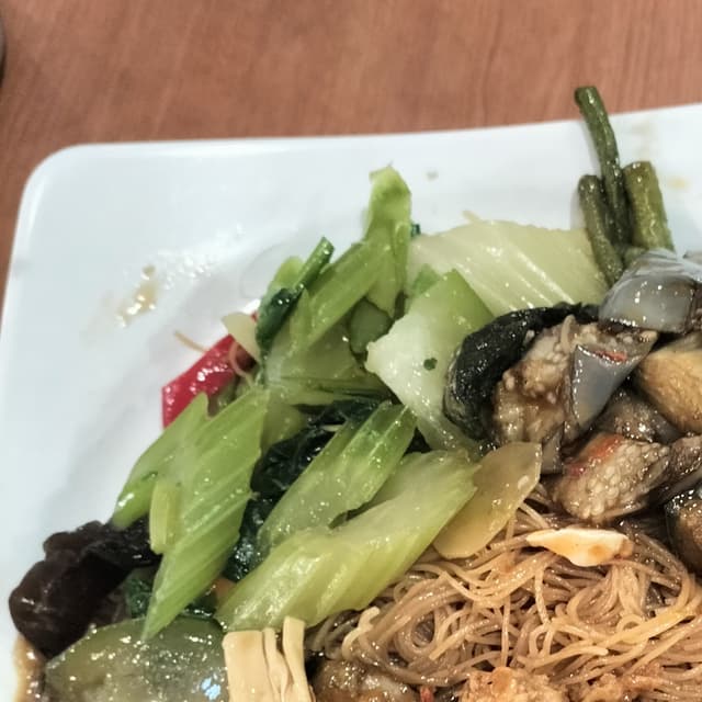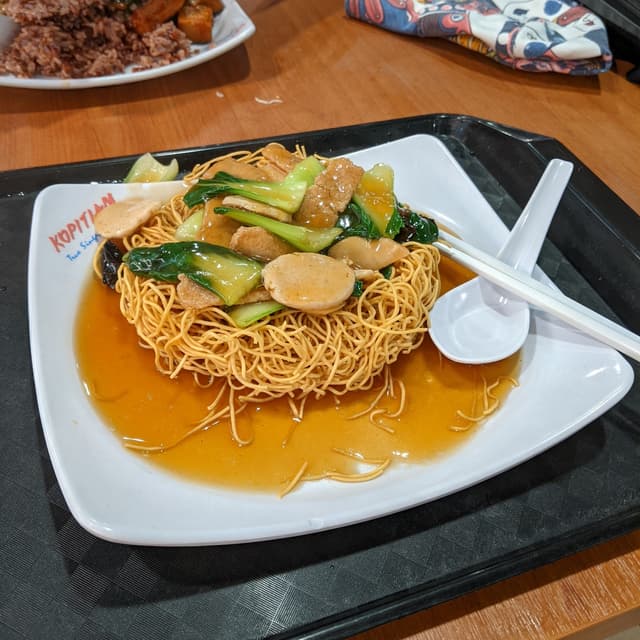 We've tried this Kopitiam foodcourt stall in basement of Vivocity before and so expected the #zichar quality to be good. We were not wrong - the hor fun (flat rice noodles) with gravy was cooked with lots of wok hei. Wish there were green veggies in this dish though. #sgvegan
