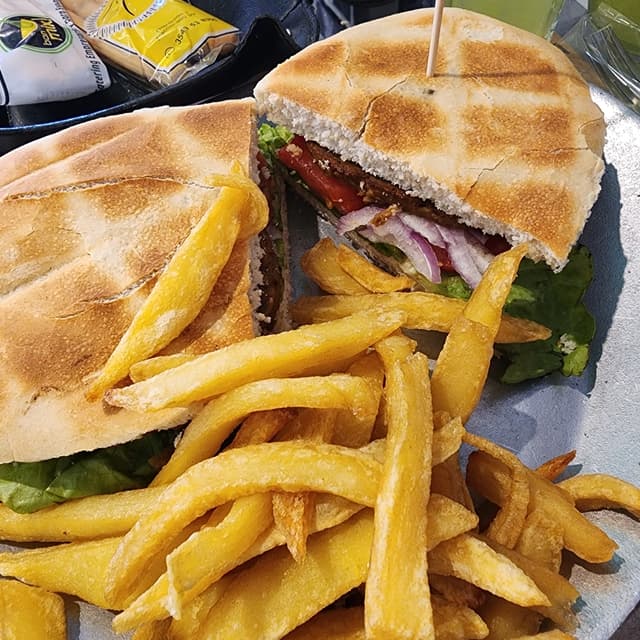 Bastante bien el seitan en cuanto a sabor, pero podría ser un poco más grueso. El pan que nos tocó estaba un poco seco. Podrían venir más papas.