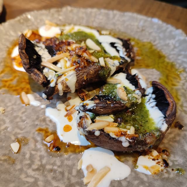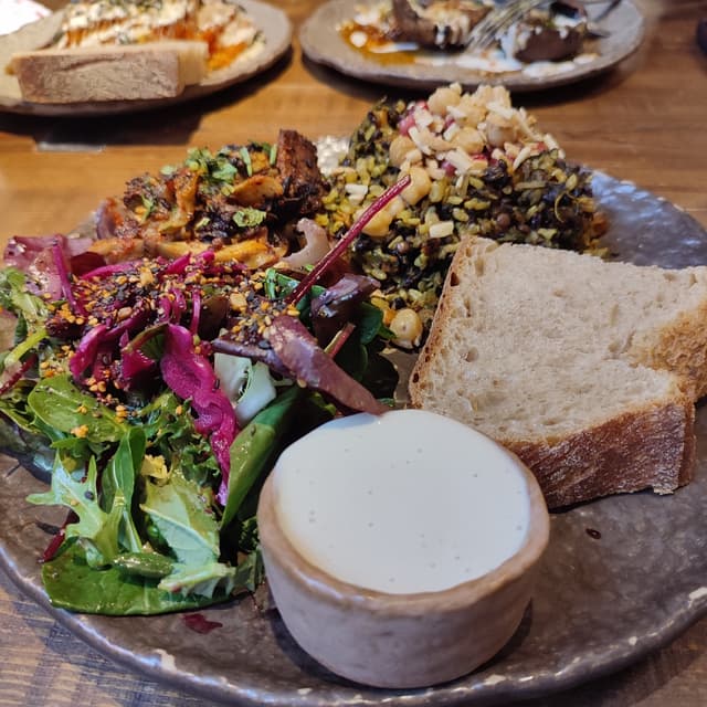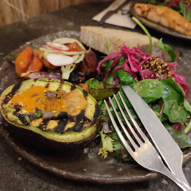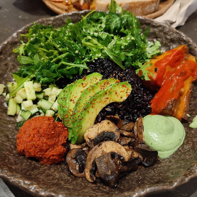 Crema de aguacate y espirulina, portobelos asados, rúcula, boniato sweet chilli, relish de pepino y sésamo, aguacate, salsa de tomate semiseco y semillas de cañamo. Con arroz negro.