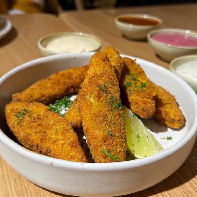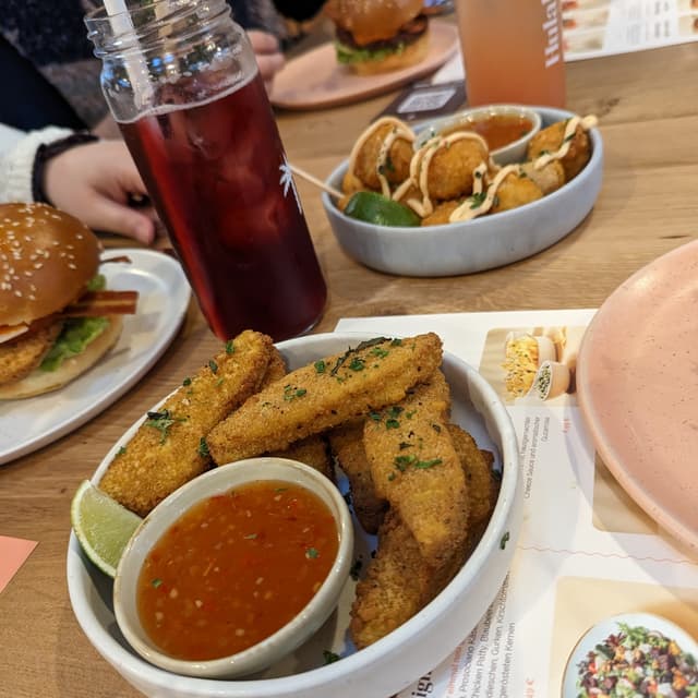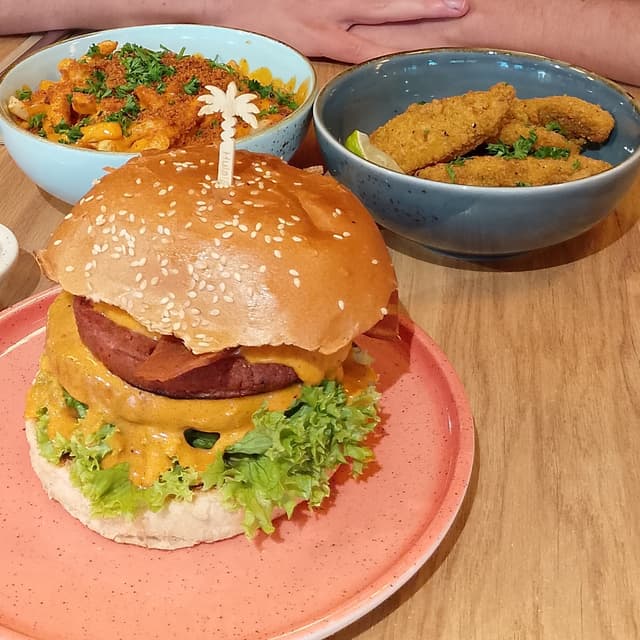 Todo lo que pedimos estaba muy rico. El sitio es 100% plant based y es lo que se conoce como un sitio de comida rápida. Las patatas (Loaded Superfries) y los nuggets (Forever Free Chickn Tenders) estaban también deliciosas. Buenísima opción que recomendaría a cualquiera.